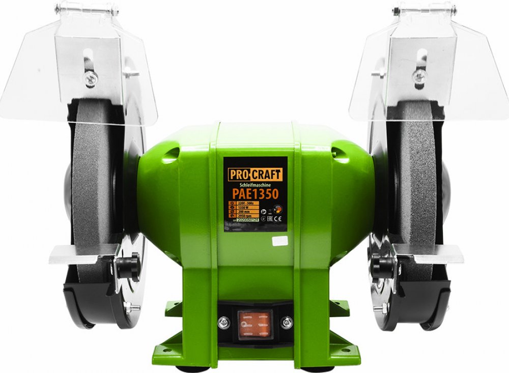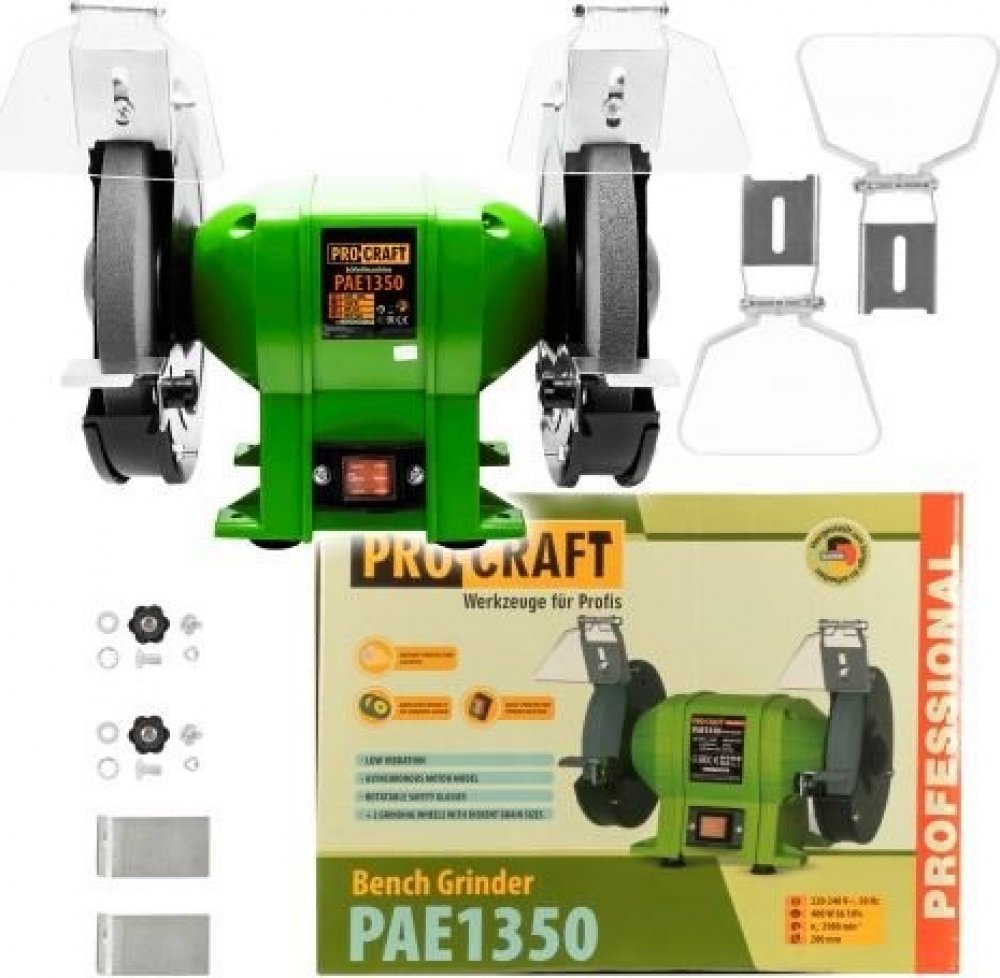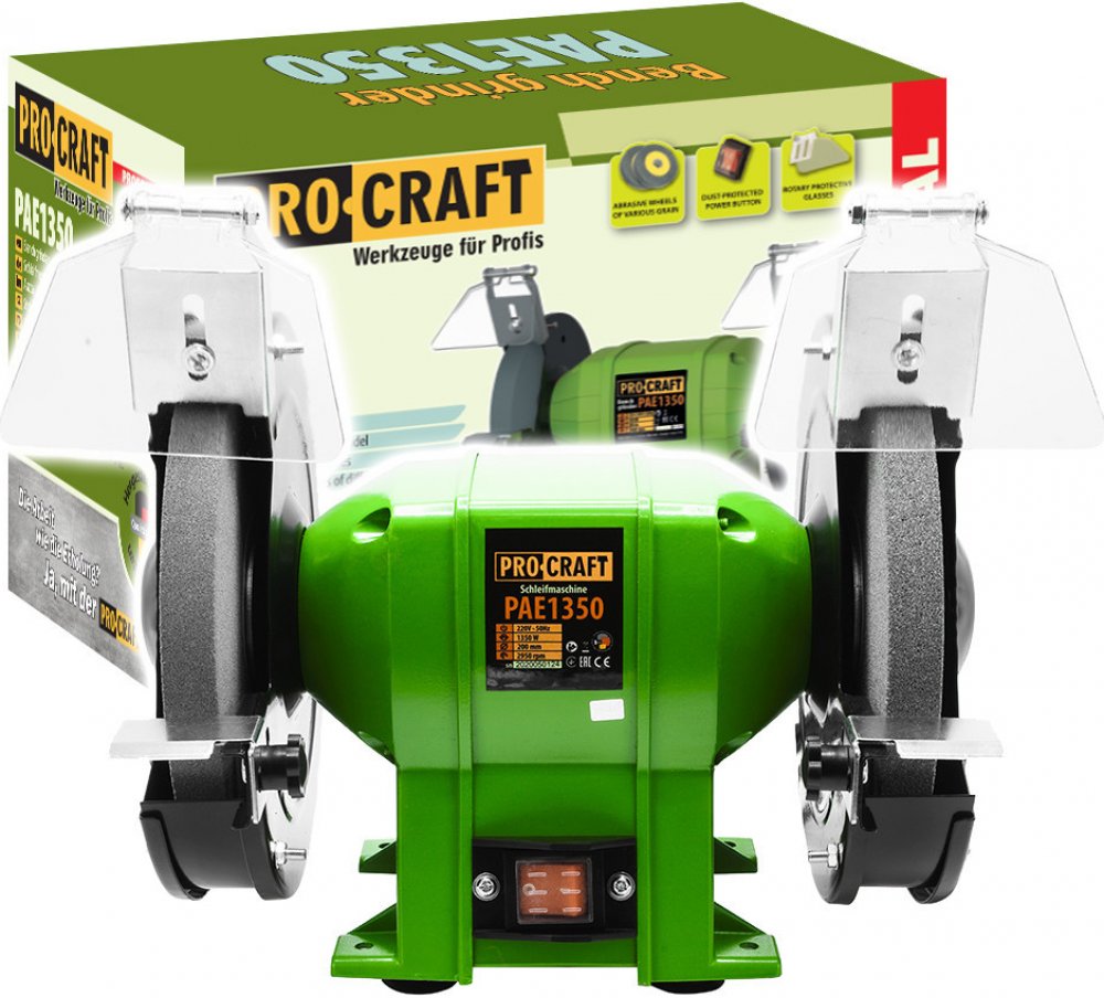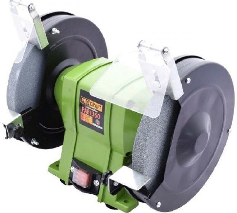 Součástí balení: kotouče o zrnitostech P80, P36 opěrné plochy pro obrobky a ochranné sklo Indukční motor, gumové nožičky Příkon (W) 350 Otáčky (ot./min) 2950 Průměr brusného kotouče (mm) 200 Závit: M12 Bruska stolní dvoukotoučová PROCRAFT PAE1350, 170W | PAE1350