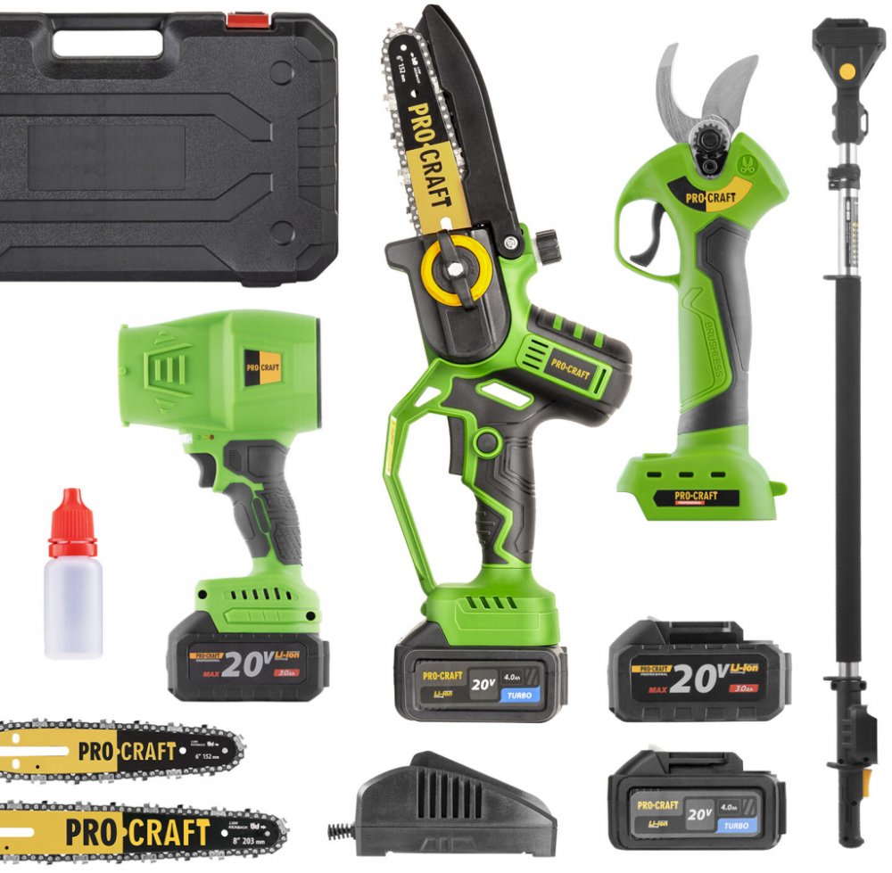 Tato komplexní sada Procraft nabízí vše, co potřebujete pro komfortní, rychlou a přesnou údržbu zahrady. Obsahuje výkonnou aku ruční pilku PKA32Li pro řezání větví, silové aku nůžky ES28LiBB pro čisté střihy, lehký a mobilní aku fukar PB18 pro úklid a praktický prodlužovací nástavec EP2.0R, který umožňuje bezpečně dosáhnout i na vyšší větve bez žebříku.