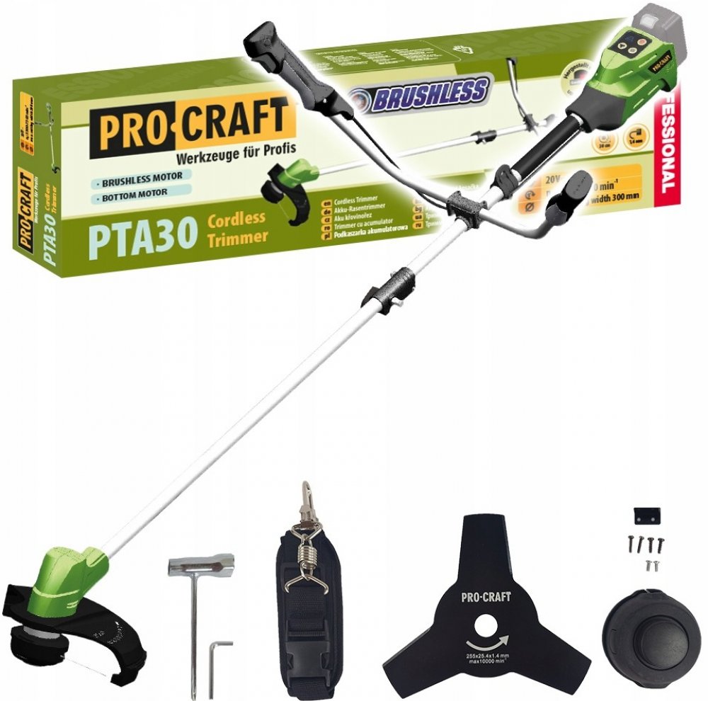 Součástí balení je aku křovinořez Procraft PTA30, strunová hlava, 3zubý kovový nůž, jednoramenný popruh, montážní klíč a návod k použití. Akumulátor a nabíječka nejsou součástí balení.