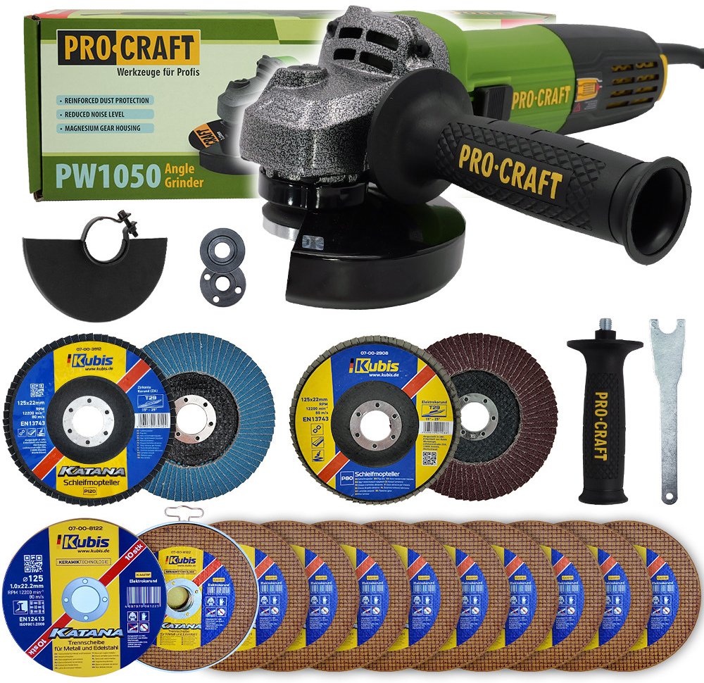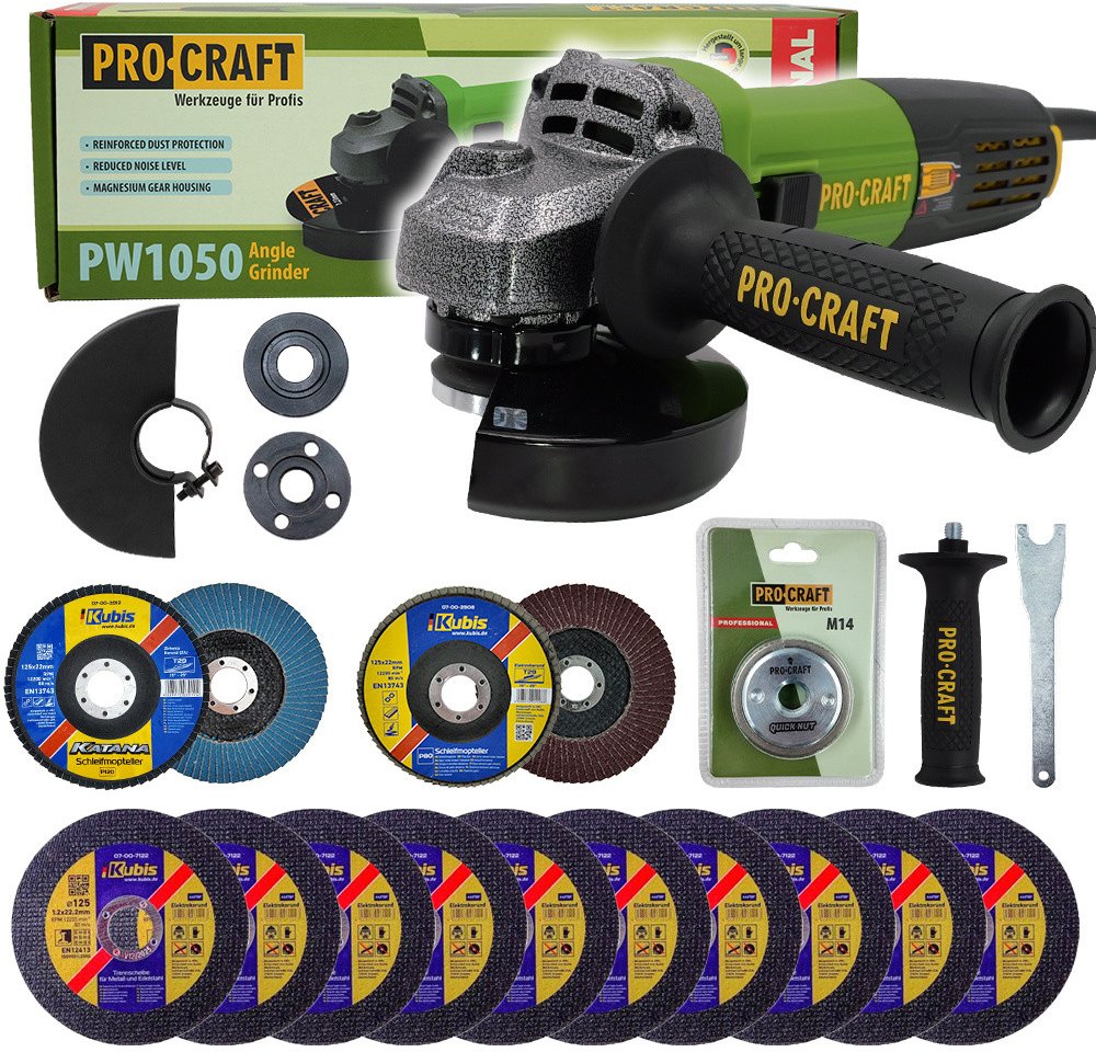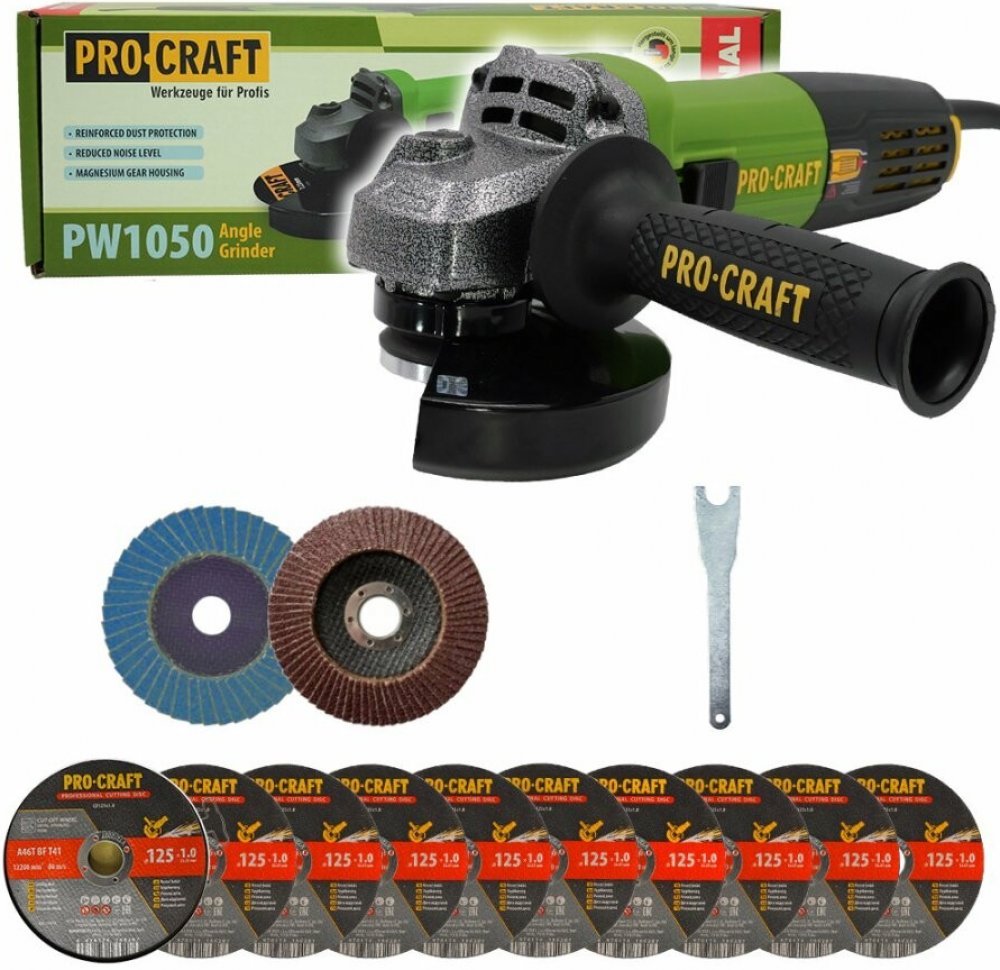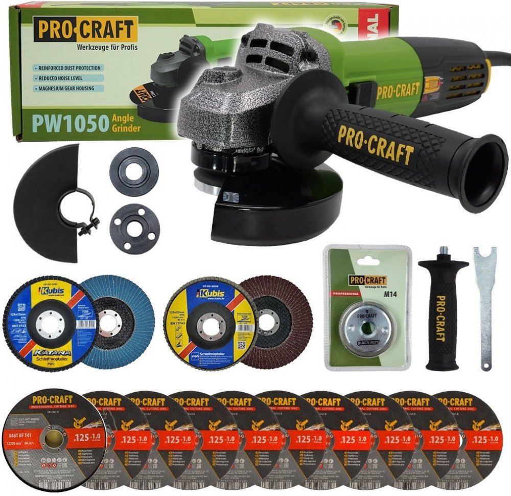 Bruska úhlová Procraft PW1050 + rychloupínací matice, 10x řezný kotouč, 2x lamelový kotouč