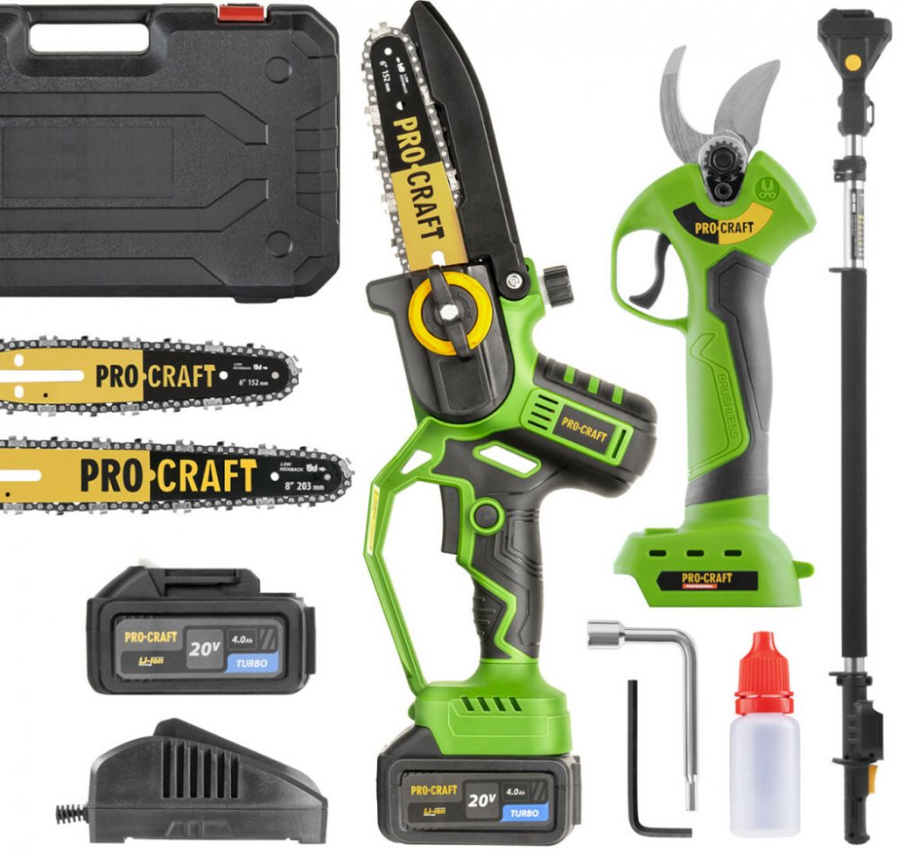 Sada aku ruční pilka PKA32Li a nůžky na větve ES28Libb + nástavec EP2.0RSada aku zahradního nářadí Procraft PKA32Li + ES28Libb + EP2.0R představuje ideální kombinaci pro každého, kdo hledá výkonný, lehký a snadno ovladatelný pomocník pro práci na zahradě. Tato sada zahrnuje jednoruční řetězovou pilku a aku nůžky na větve – obě zařízení jsou poháněna stejnou 20V Li-ion baterií, což zajišťuje maximální efektivitu a flexibilitu při práci.Klíčové vlastnosti:Bezuhlíkový motor (u obou nářadí) – vyšší výkon, delší životnost, nižší zahřívání a tichý provoz.Lehká konstrukce – hmotnost pouhých 0,7 kg (nůžky) a 1,95 kg (pilka) zajišťuje komfortní ovládání i při delší práci.Automatické mazání a rychlonapínání řetězu u pilky – snadná údržba bez nářadí.Nastavitelná šířka střihu u nůžek – výběr mezi 10/15/20/25 mm podle typu větví.Výměnné vodicí lišty (152 a 203 mm) pro různé druhy řezů.Prodlužovací otočný nástavec Procraft EP2.0R je praktické příslušenství, které výrazně rozšiřuje možnosti práce s aku pilkami a aku nůžkami značky Procraft. Díky teleskopické konstrukci nastavitelné od 1,2 do 2 m umožňuje pohodlně a bezpečně provádět řezy ve výškách, aniž byste museli použít žebřík.Ideální použití:Prořezávání stromů a keřů – díky výkonným aku nůžkám ES28Li snadno zastřihnete větve o průměru až 25 mm s možností volby šířky střihu dle potřeby.Údržba zahrad, sadů a živých plotů – sada je vhodná pro pravidelnou péči o okrasné i ovocné dřeviny.Rychlé a přesné řezání dřeva – aku pila PKA32Li se dvěma délkami lišty (152 mm a 203 mm) umožní univerzální použití pro menší dřevařské práce.Práce v těžko přístupných místech – díky nízké hmotnosti a kompaktním rozměrům obou nástrojů je možné pohodlně pracovat i nad hlavou či ve stísněném prostoru.Domácí i profesionální použití – nářadí je vhodné jak pro hobby uživatele, tak pro profesionální zahradníky díky vysokému výkonu, bezúdržbovým motorům a praktickému provedení.Obsah balení:Aku ruční pila Procraft PKA32Li2× vodicí lišty (152 mm a 203 mm)2× pilové řetězy 1/4", 1,1 mmOchranný krytKufr1× baterie 20V 4Ah1× nabíječkaAku nůžky na větve Procraft ES28Li bbMontážní klíčeTuba na mazivoProdlužovací nástavec EP2.0RSada Procraft PKA32Li + ES28Li + EP2.0R obsahuje aku řetězovou pilku, aku nůžky na větve a prodlužovací nástavec. Ideální řešení pro pohodlnou údržbu zahrady ve výškách – bez žebříku a bez námahy. Kompatibilní s 20V bateriovým systémem Procraft.ParametryOtáčky0-4700/ /minRychlost řetězu bez zatížení7 m/sDélka lišty152/203 mmRozteč řetězu1/4" Hmotnost1,95 pilka kgTyp motorubezuhlíkový Napětí20 VMaximální průměr střihu, mm10/15/20/25 Hmotnostbez baterie - 0,7 nůžky kgDélka1,2–2 mMateriálhliníková slitina TypSada