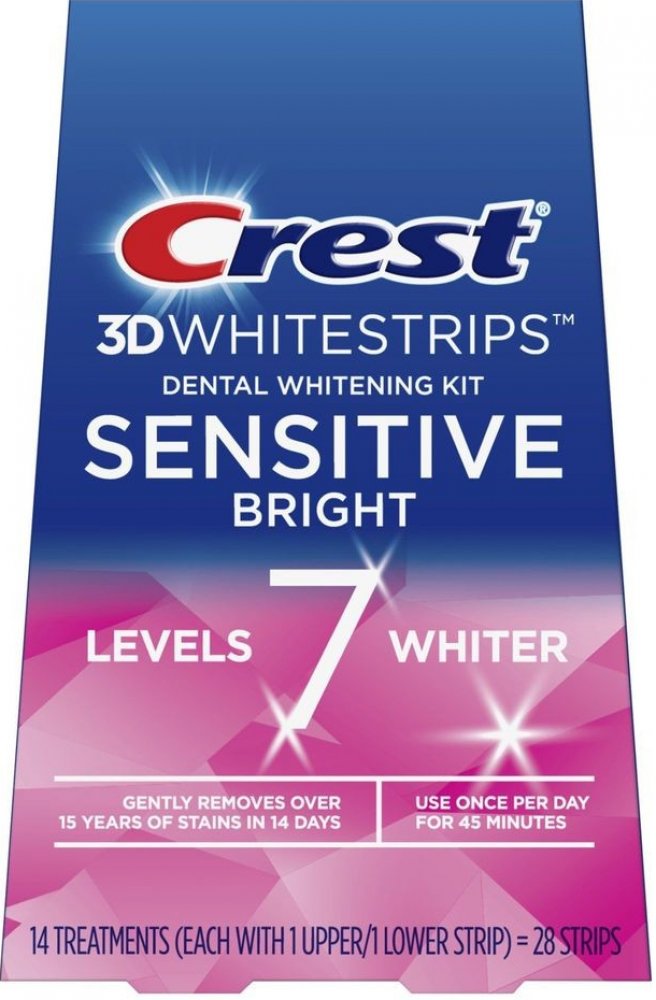 Bělící pásky na citlivé zuby Crest 3D Whitestrips SENSITIVE Bright jsou určeny k bělení citlivých zubů , nebo pro lidi s citlivými zubními krčky . Bělení probíhá postupně a velmi šetrně, ale zároveň i efektivně. Tyto pásky dokáží ze zubů odstranit zabarvení, která jsou stará i 15 let a to již za 14 dní. Zuby jsou po předepsané době používání bílé a zářivé.