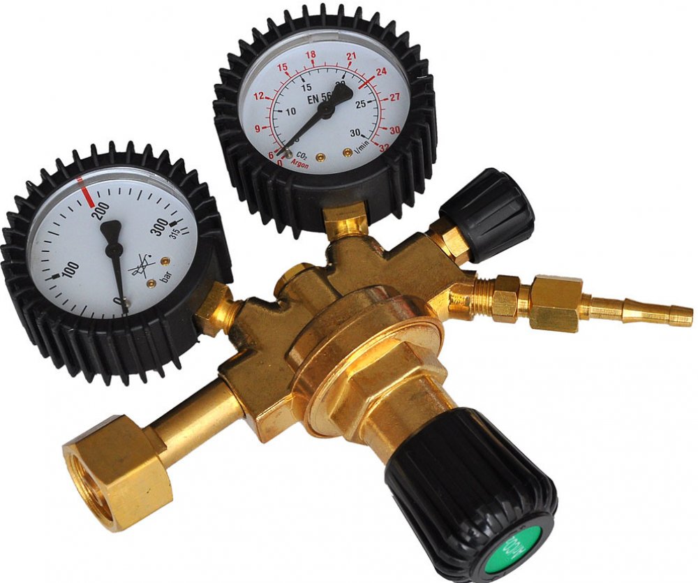 TLAKOVÝ VENTIL CO2 (kysličník uhličitý) pro technické účely. Redukční ventil je vyrobený z mosazi a vybavený dvěma manometry. Jeden ukazuje tlak kysličníku uhličitého v lahvi a druhý na výstupu. Tlakový ventil je OPATŘENÝ REGULÁTOREM s plynulou regulací tlaku na výstupu a UKONČENÝ NYPLEM (hadicový nástavec).