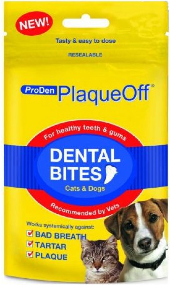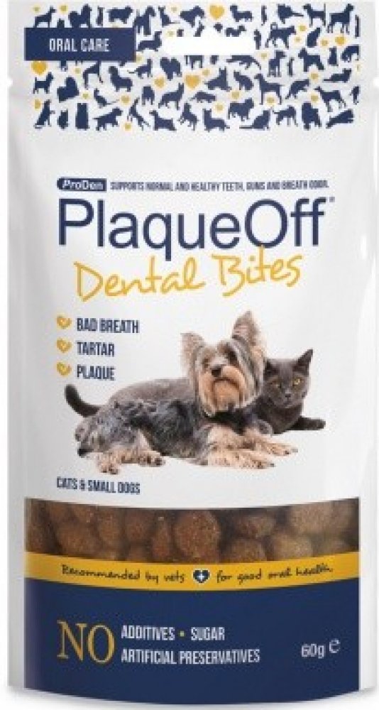 PlaqueOff™ Dental Bites se používají k odstranění a prevenci zápachu z tlamy, zubního plaku a zubního kamene. Podávají se jako pamlsek nebo odměna. PlaqueOff™ je k dostání také jako prášek, který se nasype přímo na krmení. Tyto dva výrobky můžete mezi sebou dobře kombinovat.
