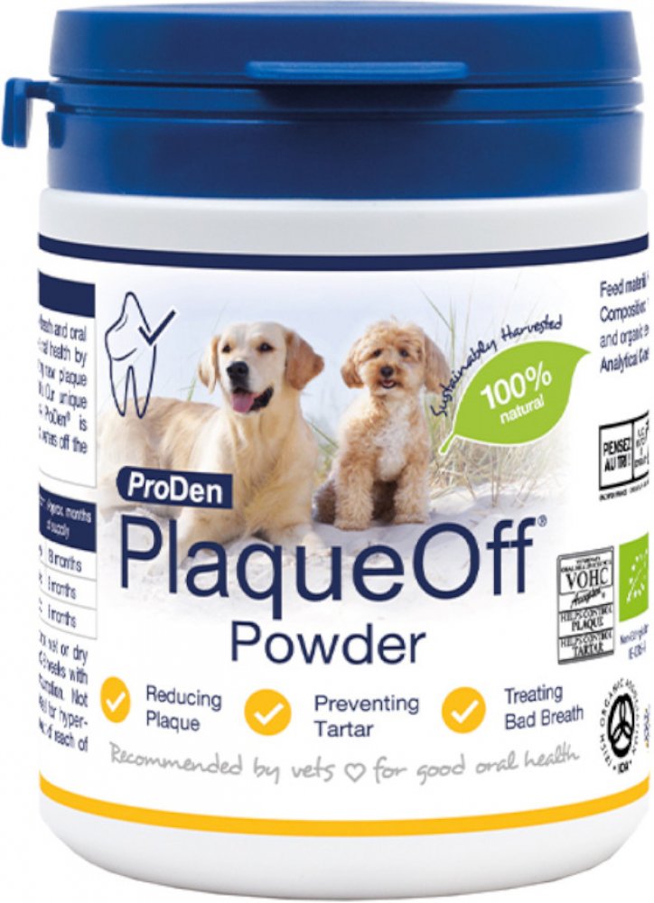 Pokud hledáte způsob, jak snížit zápach z tlamy vašeho psa, ProDen PlaqueOff Bio péče o zuby je produkt s přírodními složkami, který se snadno používá. Stačí přidat několik odměrek prášku do suchého nebo vlhkého krmiva vašeho domácího mazlíčka a můžete snadno přispět k jeho každodenní zubní hygieně. Prášek je vyroben z ekologicky pěstovaných řas. Vyznačuje se zvláštní chutí a nízkým obsahem kalorií. Pomáhá snižovat tvorbu zubního kamene a plaku. ProDen PlaqueOff Bio péče o zuby může také pomoci v boji proti stávajícímu zubnímu plaku a snížit nepříjemný zápach z úst. ProDen PlaqueOff Bio péče o zuby: Dentální péče v prášku pro psy Pro každodenní čištění zubů: podporuje zubní hygienu vašeho psa, lze podávat každý den Proti zubnímu plaku: vyvinuto pro boj proti zubnímu plaku a kameni, může přispět ke snížení tvorby zubního plaku a nového zubního kamene Pro svěží dech: může pomoci proti zápachu z tlamy Snadné použití: jednoduše přimíchejte do krmiva 100% přírodní: jako složka pouze organické řasy, speciální příchuť Velmi nízký obsah kalorií Součástí balení je odměrka
