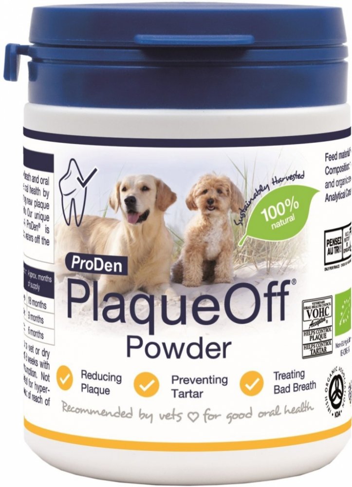 ProDen PlaqueOff Animal je výhradně přírodní produkt. Obsahuje typ mořských řas, u kterých byly prokázány speciální blahodárné účinky pro zdraví zubů a dásní. Je k dispozici ve formě sypkého prášku, takže může být do stravy snadno přidán každý den. Je bohatý na přírodní jód, obsahuje důležité vitamíny a minerály a neobsahuje umělá barviva, konzervanty, lepek a cukr. Řasy jsou schváleny WHO (Světová zdravotnická organizace), FDA (Americký ústav pro kontrolu potravin a léčiv) a FAO (Organizace Spojených národů pro potraviny a zemědělství). Schváleno jako GRAS (obecně klasifikováno jako bezpečné).