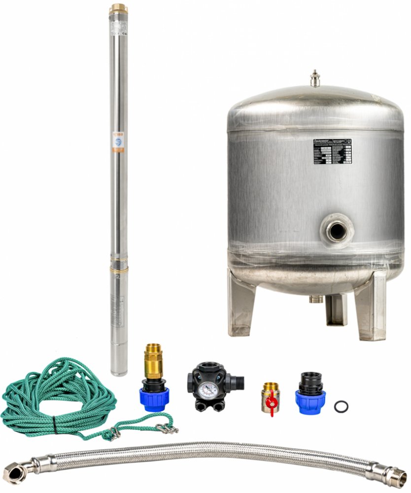 Domácí vodárna s ponorným čerpadlem 3 "STM 24 je určena k čerpání pitné a užitkové vody. Praktické využití ponorného čerpadla 3" STM 24 je především v tom, že je možné jej použít k čerpání vody z větších hloubek než 8 m. Ponorné čerpadlo 3 "STM 24 má plovoucí oběžná kola a tím zvýšenou odolnost vůči písku, nebo jiným abrazivním látkám, které se ve vodě mohou nacházet. Ponorné čerpadlo s označením RTS znamená (Resistance To Sand = odolné vůči písku) Domácí vodárna s ponorným čerpadlem 3 "STM 24 je vhodná při zřizování vodovodů v rodinných domech, chatách, letních sídlech, školách a hospodářských zařízeních, jakož i pro účely zásobování vodou na postřiky a zavlažování zahrad. Tím, že ponorné čerpadlo použité v této domácí vodárně má plovoucí oběžná kola, je možné jej použít i do čerstvých / nových studní a vrtů, protože dokáže nasát a přečerpat i vodu se zvýšeným obsahem písku či jiných abrazivních látek, které se obvykle v čerstvých / nových vrtech ještě nacházejí. Všimněte si prosím související produkty. Při každé domácí vodárně jsou produkty, které se nejčastěji používají a které můžete potřebovat. Při výběru si samozřejmě můžete prohlédnout i jiné produkty z naší široké nabídky a vybrat ty, které vám vyhovují nejvíce. Výhodou produktu - domácí vodárna s ponorným čerpadlem 3 "STM 24 / 90l - je tlaková nádoba, která je v tomto setu použita. Je to tlaková nádoba 90l nerez. Domácí vodárna s ponorným čerpadlem 3 "STM 24 / 90l nerez obsahuje: Ponorné čerpadlo 3 "STM 24Připojovací set k ponorným čerpadlům 5/4 "se zpětnou klapkouTlaková nádoba 90lIntegrovaný tlakový spínač s manometremHadice spojovací 1 "flexi 70cm s kolenemKulový ventil MF, P 5/4 "PE přechod 32/5/4 "" vnitřní závit