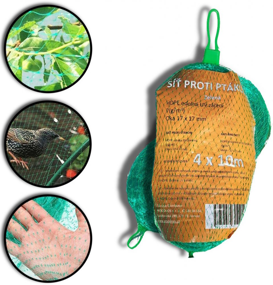 Ochranná síť proti ptákům PRODOMOS poskytuje spolehlivou a účinnou ochranou plodin před škodlivou činností ptactva. Je lehká a velmi odolná proti jakékoliv deformaci a UV záření. Díky své konstrukci umožňuje maximální přístup světlu, vlhkosti a vzduchu. Snadno se instaluje a může být umístěna na nosnou konstrukci nebo přímo položena na plodiny či koruny stromů. Tento typ ochranné sítě slouží pouze k ochraně plodin a nijak neubližuje ptákům.