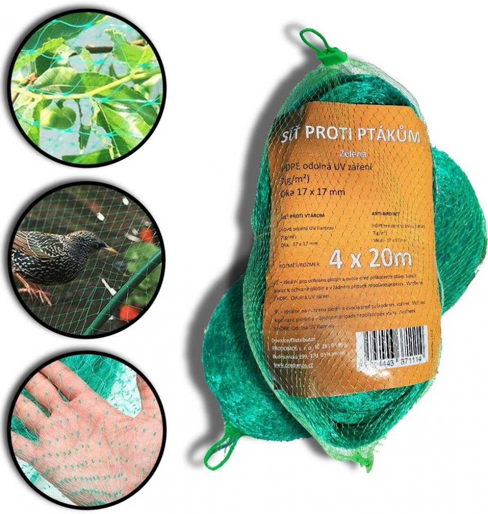 Ochranná síť proti ptákům PRODOMOS poskytuje spolehlivou a účinnou ochranou plodin před škodlivou činností ptactva. Je lehká a velmi odolná proti jakékoliv deformaci a UV záření. Díky své konstrukci umožňuje maximální přístup světlu, vlhkosti a vzduchu. Snadno se instaluje a může být umístěna na nosnou konstrukci nebo přímo položena na plodiny či koruny stromů. Tento typ ochranné sítě slouží pouze k ochraně plodin a nijak neubližuje ptákům.