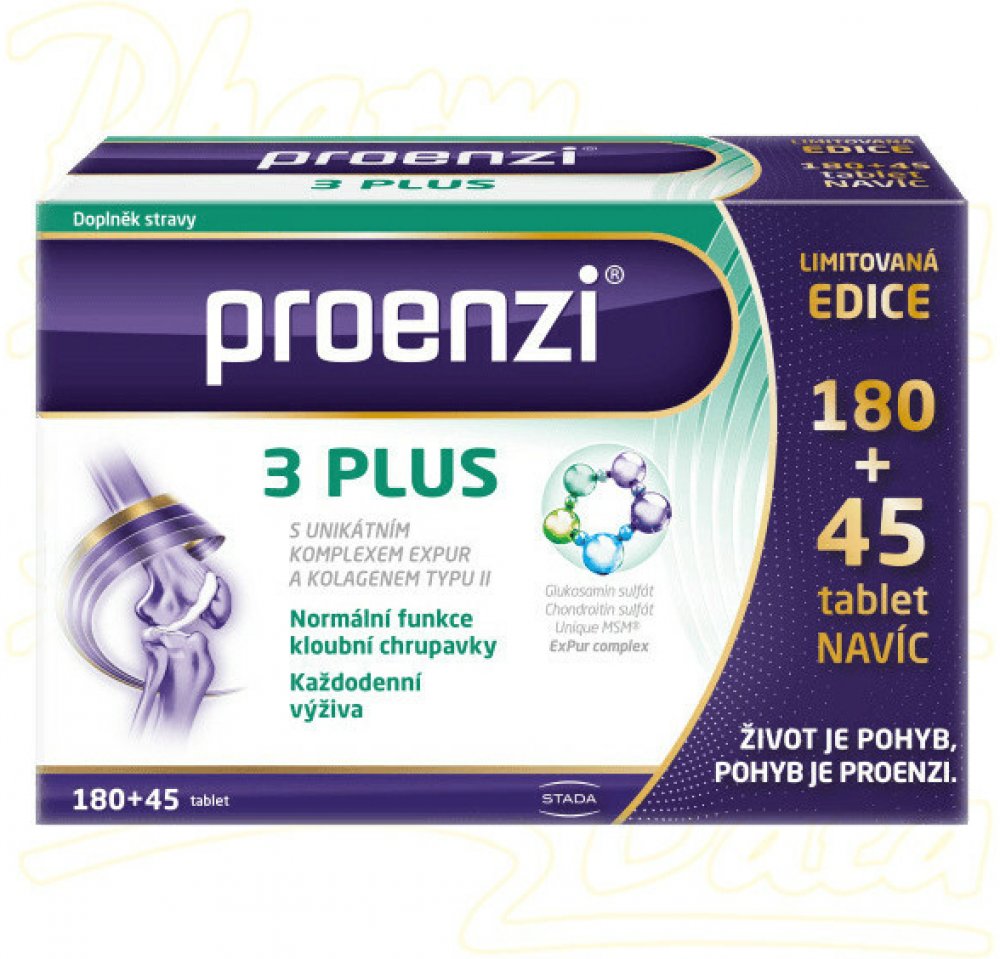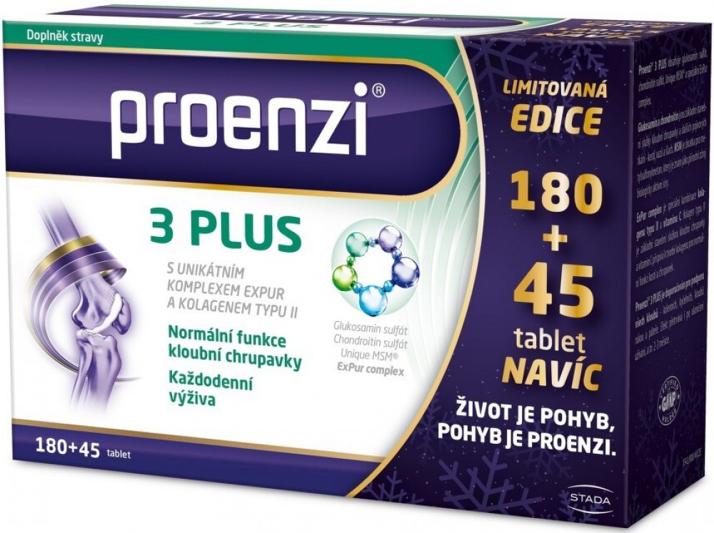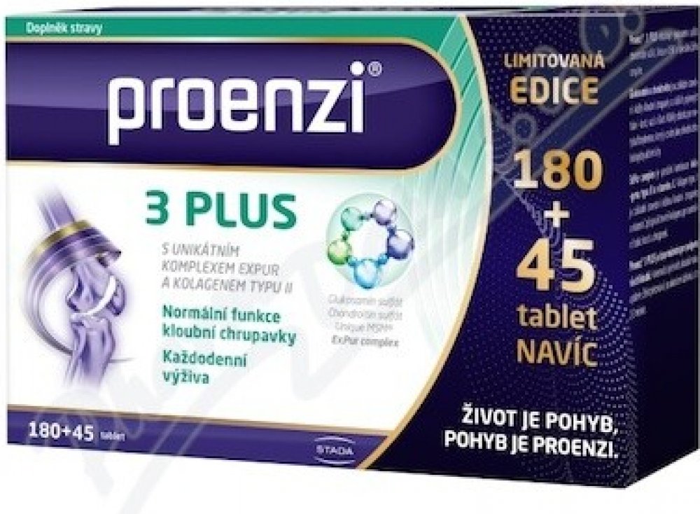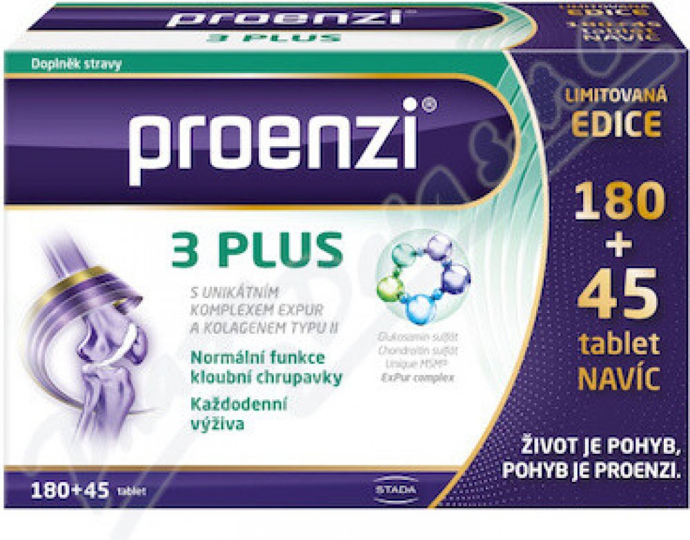 Proenzi 3 plus je špičková péče o vaše klouby. Vyvážená receptura obohacená o unikátní ExPur komplex složený z kolagenu a vitaminu C. Obsahuje glukosamin, chondroitin a kolagen typu II. Vhodný pro všechny klouby a pojivové tkáně. Vitamin C podporuje tvorbu kolagenu pro normální funkci chrupavek.
