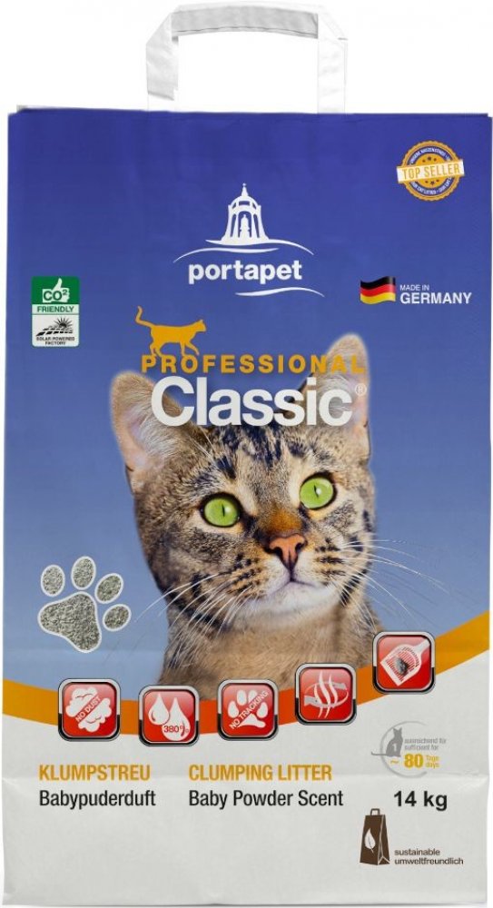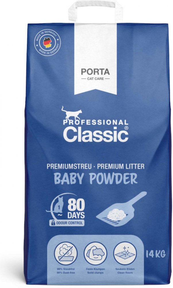 Dokonce i ty nejjemnější packy si užijí stelivo Professional Classic s vůní dětského pudru. Hrudkující stelivo vyniká lehkou vůní dětského pudru. Vůně je aktivována při kontaktu s vlhkostí, takže kočičí toaleta nezapáchá. Rychle hrudkující stelivo má savost až 380 %. Díky vysoce kvalitnímu zpracování je k tomu z 99 % bezprašné. Proto je tento kočkolit obzvláště vhodný pro zvířata a lidi citlivé na prach. Kočkolit je vyráběn v Německu s pomocí solární energie, obal je samozřejmě ze 100% recyklovatelného materiálu. Přitom děláte něco dobrého nejen pro vaši kočku, ale zároveň chráníte životní prostředí. Professional Classic stelivo pro kočky s vůní dětského pudru v přehledu: Kvalitní kočkolit ze sodíkového betonitu 100% přírodní sodíkový betonit: vyrobený se sluneční energií a bez přísad Bez prachu: až 99% bezprašné Šetrné k životnímu prostředí: 100% recyklovatelný papírový obal Rychlé a snadné: úspornost díky tvorbě hrudek spolu s vysokou savostí S jemnou vůní: Vlhkost aktivuje lehkou vůni dětského pudru Made in Germany Jemné tlapky - jemný kočkolit. Professional Classic stelivo pro kočky s pohlcovačem zápachu nedá zápachům Vaší kočky žádnou šanci. Kvalitní stelivo je totiž vybaveno přírodním pohlcovačem zápachů a zajišťuje tak, příjemnou vůni kočičí toalety. Vysoká savost až 380 % zajišťuje obzvláště pevné hrudky. V kombinaci s 99% bezprašnou recepturou zůstane váš byt ušetřen velmi malých hrudek. Kočkolit je vyroben obzvláště šetrně k životnímu prostředí, jelikož je vyráběn s pomocí solární energie. Kromě toho je papírový obal 100% recyklovatelný. S kočkolitem Professional Classic děláte něco dobrého nejen pro vaši kočku, ale také pro životní prostředí. Professional Classic kočkolit s pohlcovačem zápachů v přehledu: Kočkolit ze sodíkového betonitu Rychlá tvorba pevných hrudek: vysoká vydatnost díky 380% savosti Z 99 % bezprašné: pro čisté okolí Ekologické: vyráběno s pomocí solární energie, bez doplňkových látek Praktická taška: 100% recyklovatelný papírový obal Pro citlivé nosy: bez parfémů, pro kočky citlivé na zápach Made in Germany Využijte naší skvělé nabídky! Pouze po omezenou dobu: nyní při koupi 14 kg Professional Classic získáte skvělou slevu! Neopomeňte prosím, že se uvedená nabídka vztahuje pouze na produkt č. 1324712.