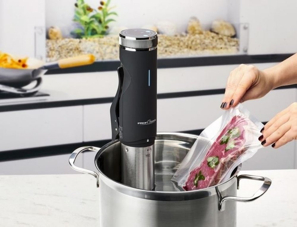 Ponorný vařič pro pomalé vaření ProfiCook PC-SV 1126 Sous Vide je speciálně určený pro přípravu vakuově zabalených potravin. Kuchařská metoda Sous Vide se vyznačuje vařením ingrediencí ve vzduchotěsném umělohmotném obalu ve vodní lázni s kontrolovanou teplotou. Takto upravované potraviny, ať už to je maso, ryby, zelenina nebo ovoce, si zachovají svou přirozenou chuť, šťávu, vitaminy a živiny. Přís...