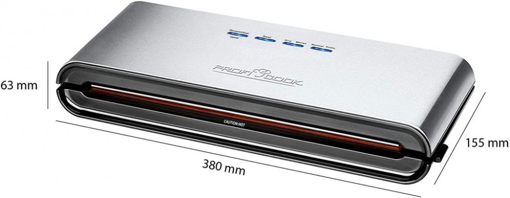 Automatická a vysoce výkonná svářečka folií vyrobená z nerezové oceli je ideální pro porcování jídla bez přidávání konzervačních látek. Potraviny díky vytvoření vakua vydrží čerstvé až 5x déle. Zároveň folie chrání potraviny před poškozením mrazem. Svářečku lze také použít pro marinované a kořeněné potraviny. Tato svářečka folií se skvěle hodí také pro Sous Vide vaření, kdy se potraviny vaří ve vlastní šťávě bez vysychání a neztrácejí potřebné živiny během přípravy. Sací výkon svářečky je 12 l/min. Vytvoří přibližně 90% vakuum -0,8 bar. Folie může být široká maximálně 30 cm a dlouhá dle potřeby. Součástí balení jsou profesionální plastové sáčky, kdy 10 kusů je o rozměrech 22x30 cm a 8 kusů 28x40 cm. Pro kontrolu provozu slouží 6 kontrolek. Ve spodní části je prostor pro umístění napájecího kabelu, což se hodí pro jednodušší skladování nebo transport. Napájení je 220-240 V, 50 Hz a výkon 120 W.