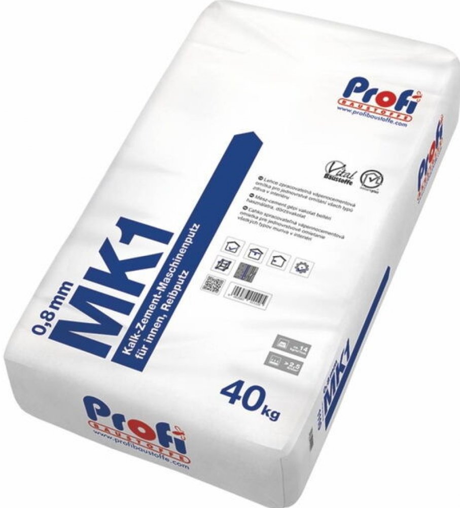 Profi MK 1 je vápenocementová omítka o zrnitosti 0,8 mm pro jednovrstvé omítání všech typů zdiva v interiéru.PoužitíPro novostavby i rekonstrukceJe vhodná do vlhkých prostor a jako štuk na sanační omítkyLze nanést jako vícevrstvou omítku (jádrová vrstva + štuk s filcovaným povrchem)Slouží jako podklad pod obkladyVlastnostiVynikající zpracovatelnostVysoká paropropustnostRuční a strojní zpracováníZrnitost do 0,8 mmVýhodyŠetrná ke strojnímu zařízeníNízká spotřebaNepraskáTechnické parametrySpotřeba materiálu: cca 14 kg/m²/cmPevnost v tlaku: > 2,5 N/mm²Balení: v 40 kg papírových pytlech