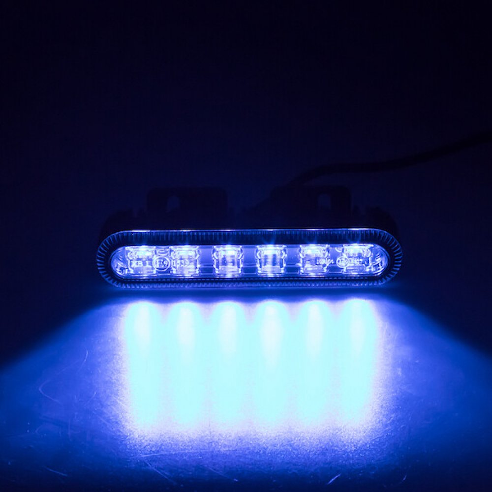 Přídavné modré výstražné LED světlo pro externí povrchovou montáž. Technické parametry:•homologace 10R-04*E9*6827 přímo na skle•homologace R65 XB1-E9-00.1539 (zvláštní výstražná světla) - vyražená na skle•6x vysoce výkonné SMD LED diody 3 W•minimální odběr proudu•10 různých přednastavených programů pro blikání•synchronizace s dalšímy světly stejného typu•odolná konstrukce chránící proti vlhkosti a otřesům (IP 67)•životnost až 100.000 hodin•rozměry: 142 x 30 x 35 mm•napájecí napětí: 12 - 24 V•příkon: 14 W•pracovní teplota - 40 - + 65° C•délka napájecího kabelu 30 cm Zapojení:•červený + 12 - 24 V•černý - zem•bílým vodičem se mění program blikání (+), spojením bílých vodičů se synchronizuje s dalšími světly.