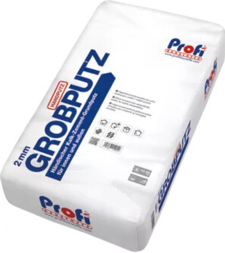PROFIBAU GROBPUTZ jádrová omítka 25kg, zrno 2mmPoužitíPro omítání všech běžných typů zdiva, slouží jako podklad pod štukové omítky, případně jako podklad pod keramické obklady. Lze použít také pro zdění a pro drobné opravy.VlastnostiVysoká pevnost, dobrá zpracovatelnost.SloženíCement, vápenný hydrát, vápencová drť ≤ 2 mm, přísady Technické údajeSpotřeba materiálu cca 15 kg/m²/cm Tloušťka vrstvy vnější stěna: min. 15 mm vnitřní stěna: min. vnitřní 10 mm vnitřní strop: min. 8 mm Spotřeba vody cca 3,5 litrů čisté vody/25 kg pytel cca 5,5–6 litrů čisté vody/40 kg pytel Pevnost v tlaku > 6 N/mm² Pevnost v tahu za ohybu > 2 N/mm² Objemová hmotnost v suchém stavu cca 1900 kg/m³ Faktor difúzního odporu μ cca 20 Koeficient tepelné vodivosti λ 1,4 W/(m·K) MícháníPři míchání v bubnové míchačce činí doba míchání 3 až 5 minut. Pro aplikaci omítky na menší plochy je možné pro míchání použít také nízkootáčkové míchadlo. Ke směsi není dovoleno přimíchávat cizí materiály. Pracovní postupNa připravený podklad se nanese vrstva jádrové omítky (max. 30 mm v jednom kroku), povrch se srovná hliníkovou Hlatí (pečlivé srovnání usnadní další zpracování) a po zavadnutí se nerovnosti seříznou klínovou latí. Při celkové tloušťce omítky větší jak 30 mm se doporučuje dvouvrstvá aplikace, kdy se štuková vrstva nanáší nejdříve po 1 dni od aplikace jádrové vrstvy, jejíž povrch je zapotřebí vodorovně zdrsnit. V průběhu zrání je třeba povrch omítky chránit před nadměrným vyschnutím (průvan).