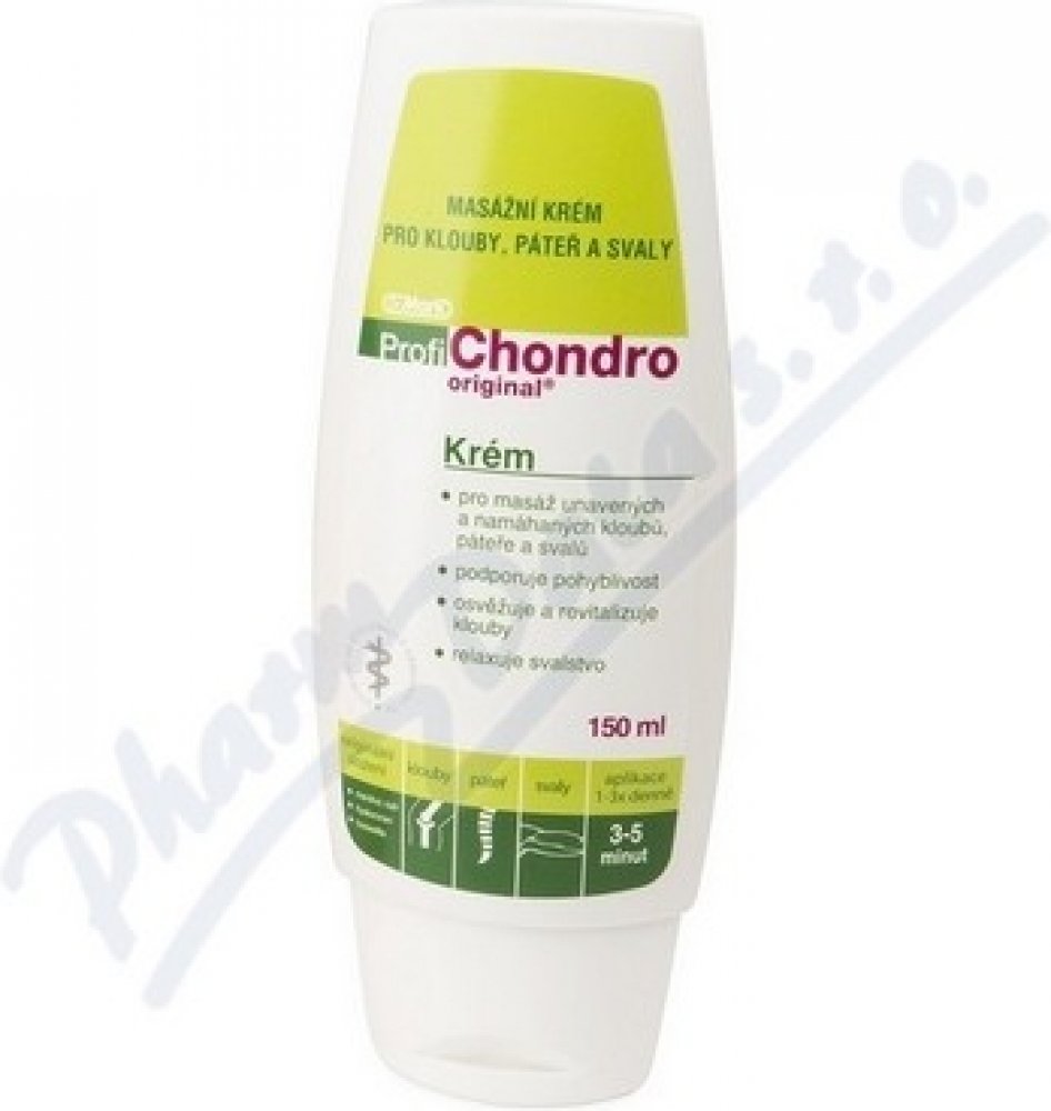ProfiChondro Original® Krém je určený pro masáž pokožky v oblasti unavených a namáhaných kloubů, páteře a svalů. Má originální osvěžující složení s mentholem, kafrem, kyselinou hyaluronovou a extrakty bylin. Díky nemastnému složení se rychle vstřebává beze zbytku.