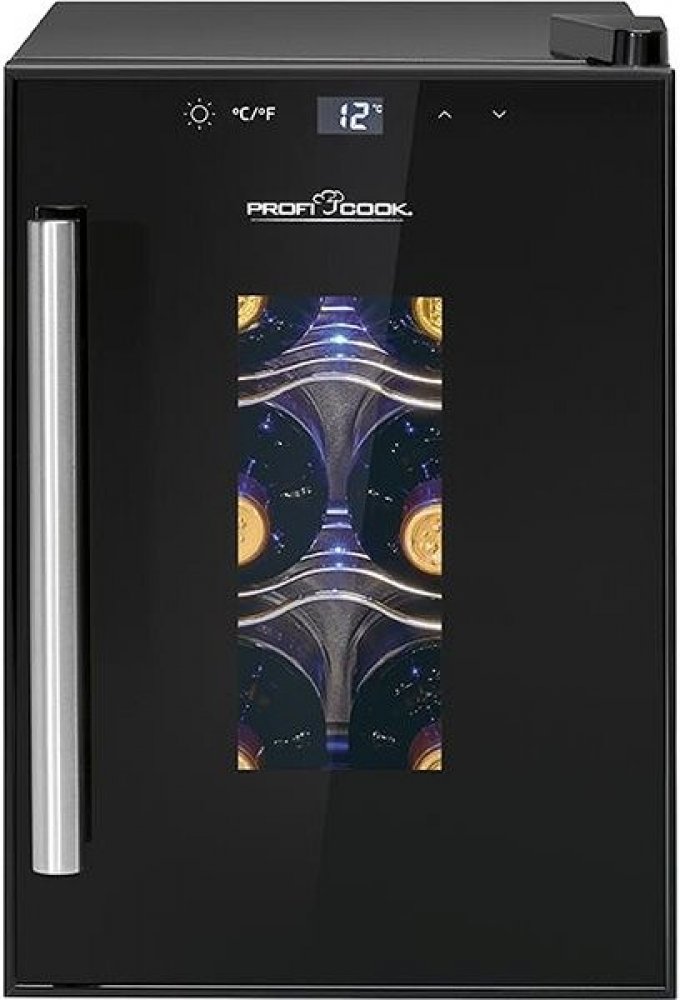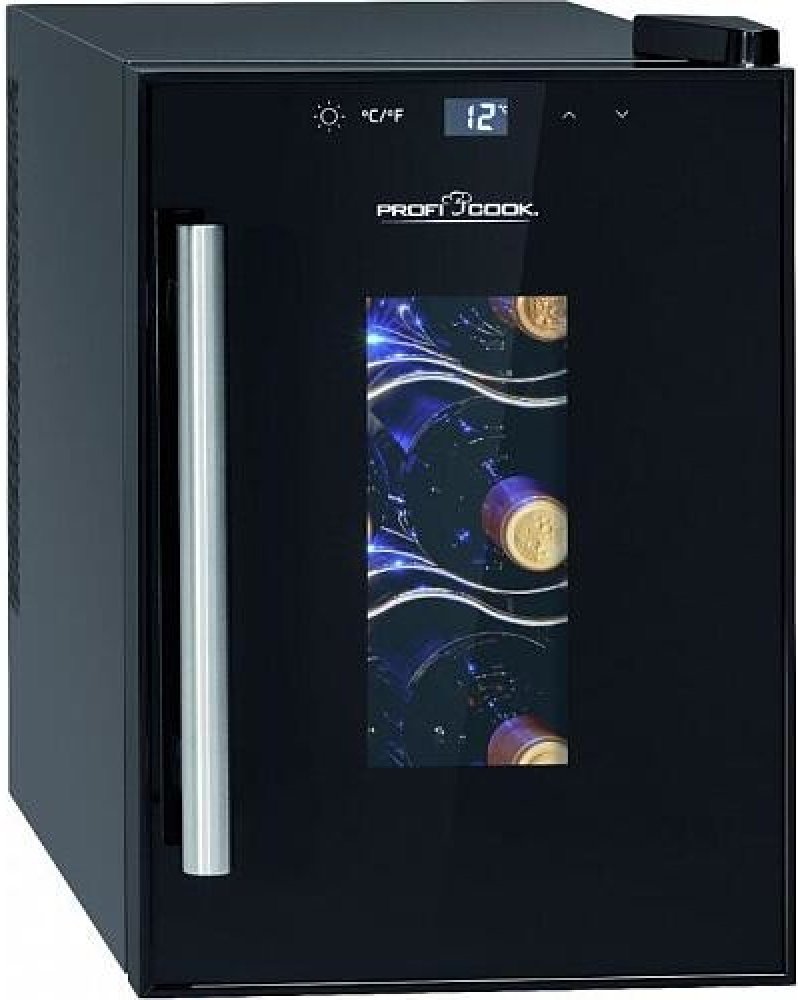 ProfiCook WK 1230 – Vinotéka . Energetická třída G . Hlučnost 26 dB . Kapacita 17 L / 6 lahví . Rozsah chlazení 11 až +18 °C . Modré LED osvětlení interiéru. Antivibrační systém. Senzorové dotykové ovládání. Modře podsvícený LCD displej. Elektronická regulace teploty. Teplotní rozsah: +11 °C až +18 °C.