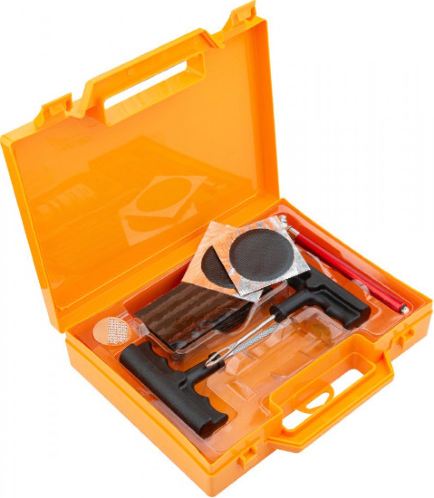 Souprava je určena na opravu defektů způsobených na pneumatikách. Defekt můžete jednoduše zalepit, nebo jej opravit pomocí šňůry k tomu určené. Stačí počkat pár minut a pneumatika bude připravena k použití. Sada také obsahuje nástroj pro měření tlaku v pneumatikách. Sadu v praktickém kufříku můžete umístit do kufru vašeho auta, a tak se nemusíte obávat už žádného defektu.