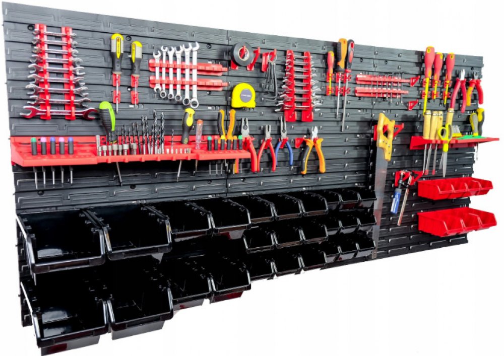 STĚNA NA NÁŘADÍ 172X78CM + 33 BOXŮ Závěsná stěna na nářadí je skvělý způsob, jak ušetřit prostor a mít přehled v nářadí a součástkách. Praktická sada pro uložení potřebného vybavení pro vaši dílnu, sklad, garáž nebo technickou místnost. Stěny na nářadí jsou praktické, odolné a díky nim vždy budete vědět, kde je co uloženo. Vyznačují se také jednoduchou montáží a možnost vlastního přizpůsobení si složek a držáků na stěně. Stěna o rozměru 1728 x 780mm poskytne dostatek prostoru pro uložení potřebného nářadí, 33 přídavných boxů poslouží jako úložný prostor pro šrouby, hřebíky, matice nebo různé náhradní díly. Modulární struktura desek umožňuje libovolné uspořádání desek, držáků a boxů. Boxy, police a držáky lze uspořádat podle své preference. Děrovaná stěna na nářadí obsahuje police a držáky nářadí. Nářadí není součástí balení. Sada obsahuje: 6x deska na zeď4x věšáky na ploché / očkové klíče (2 vertikální | 2 horizontální)8x věšáků 5,5 cm8x věšáků 3,5 cm16x úchytů klipového typu2x police na nářadí