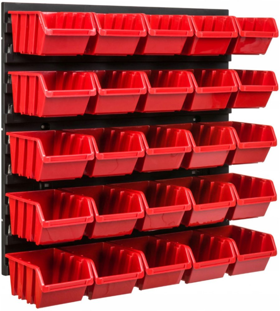 STĚNA NA NÁŘADÍ 39 X 39CM + 25 BOXŮ RED Závěsná stěna na nářadí je skvělý způsob, jak ušetřit prostor a mít přehled v nářadí a součástkách. Praktická sada pro uložení potřebného vybavení pro vaši dílnu, sklad, garáž nebo technickou místnost. Stěny na nářadí jsou praktické, odolné a díky nim vždy budete vědět, kde je co uloženo. Vyznačují se také jednoduchou montáží a možnost vlastního přizpůsobení...