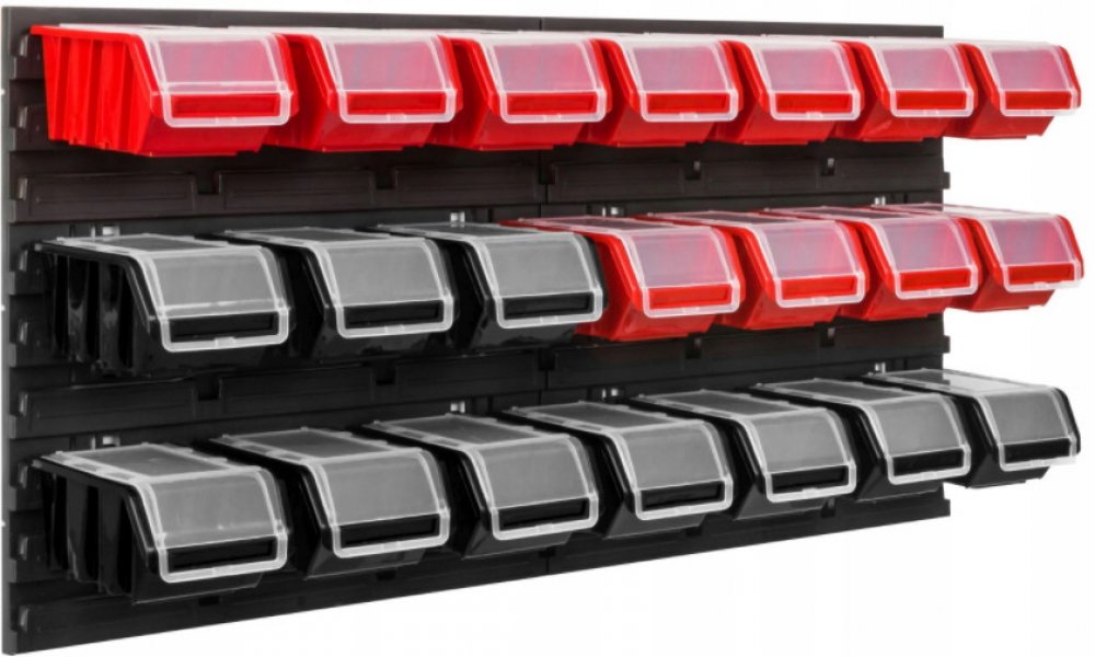 STĚNA NA NÁŘADÍ 78X39CM + 21 BOXŮ Závěsná stěna na nářadí je skvělý způsob, jak ušetřit prostor a mít přehled v nářadí a součástkách. Praktická sada pro uložení potřebného vybavení pro vaši dílnu, sklad, garáž nebo technickou místnost. Stěny na nářadí jsou praktické, odolné a díky nim vždy budete vědět, kde je co uloženo. Vyznačují se také jednoduchou montáží a možnost vlastního přizpůsobení si složek a držáků na stěně. Stěna o rozměru 780 x 390mm poskytne dostatek prostoru pro uložení potřebného nářadí, 32 přídavných boxů poslouží jako úložný prostor pro šrouby, hřebíky, matice nebo různé náhradní díly. Modulární struktura desek umožňuje libovolné uspořádání desek a boxů. Boxy jsou uzavíratelné. Sada obsahuje: 2x deska na zeď32x box Typy boxů: 100 x 155 x 70mm červená - 11ks100 x 155 x 70mm černá - 10ks