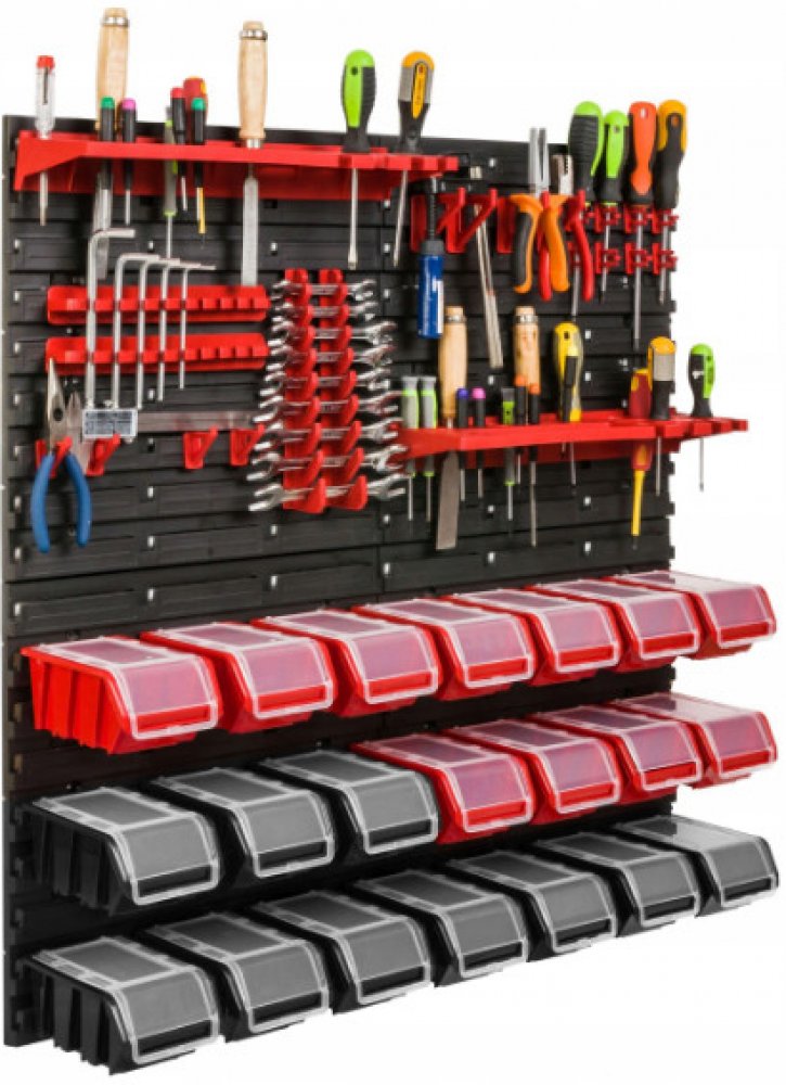 Stěna na nářadí o rozměrech 78x78cm. Stěna na nářadí je skvělý způsob, jak ušetřit prostor a mít přehled v nářadí a součástkách. Praktická sada pro uložení potřebného vybavení pro vaši dílnu, sklad, garáž nebo technickou místnost. Jednoduchý montážní systém. Možnost vlastního přizpůsobení si složek a držáků na stěně. Uzavíratelné složky chrání nástroje a součástky před prachem a vlhkostí. Nabízená sada se skládá ze stěny s držáky na nářadí a 21 odkládacích nádob. Celkové rozměry (Š x V): 780 x 780 mm 21 odkládacích nádob:11 ks | 100 x 155 x 70 mm | červená barva10 ks | 100 x 155 x 70 mm | černá barva