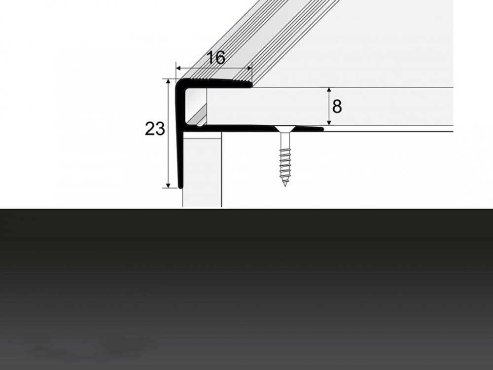 Schodový profil o tloušťce materiálu do 8 mm pro zasunutí podlahové krytiny. Je opatřen na nášlapné straně protiskluzovými drážkami.