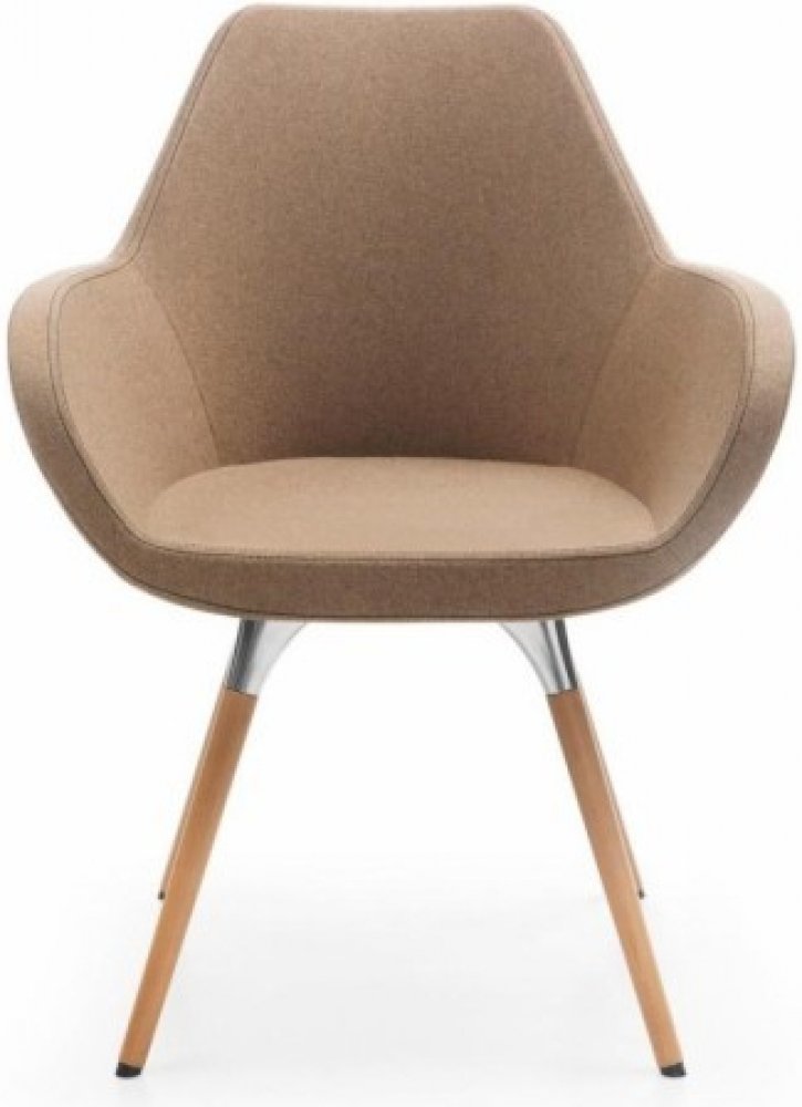 Čalouněné elegantní křesílko zaujme svým designem. Dřevěná kostra je 4 nohá a je kombinovaná s kovovým leštěným úchytem pod sedákem. Tato podnož dodává produktu osobitý styl. Křesílko se hodí pro konferenční účely ale i jako solitér do soukromého interiéru. Prošití křesílka lze zvolit – může být v
