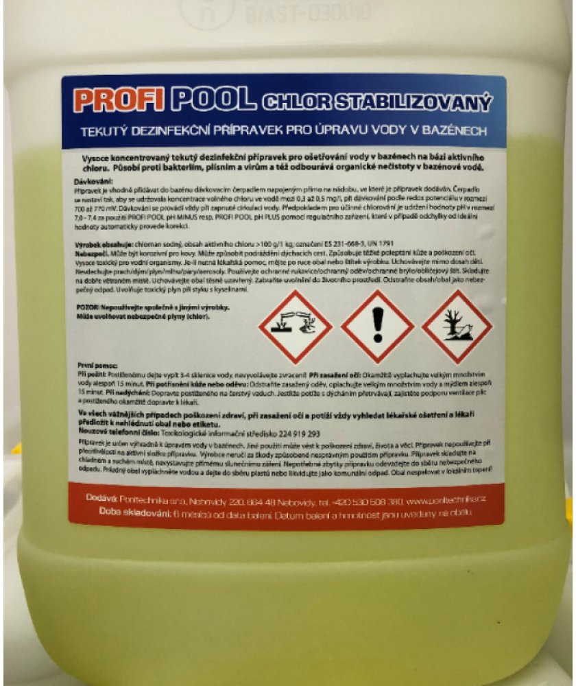 Dávkování: Přípravek je vhodné přidávat do bazénu dávkovacím čerpadlem napojeným přímo na nádobu, ve které je přípravek dodáván. Čerpadlo se nastaví tak, aby se udržovala koncentrace volného chloru ve vodě mezi 0,3 až 0,5 mg/l, při dávkování podle redox potenciálu v rozmezí 700 až 770 mV. Dávkování se provádí vždy při zapnuté cirkulaci vody. Předpokladem pro účinné chlorování je udržení hodnoty pH...