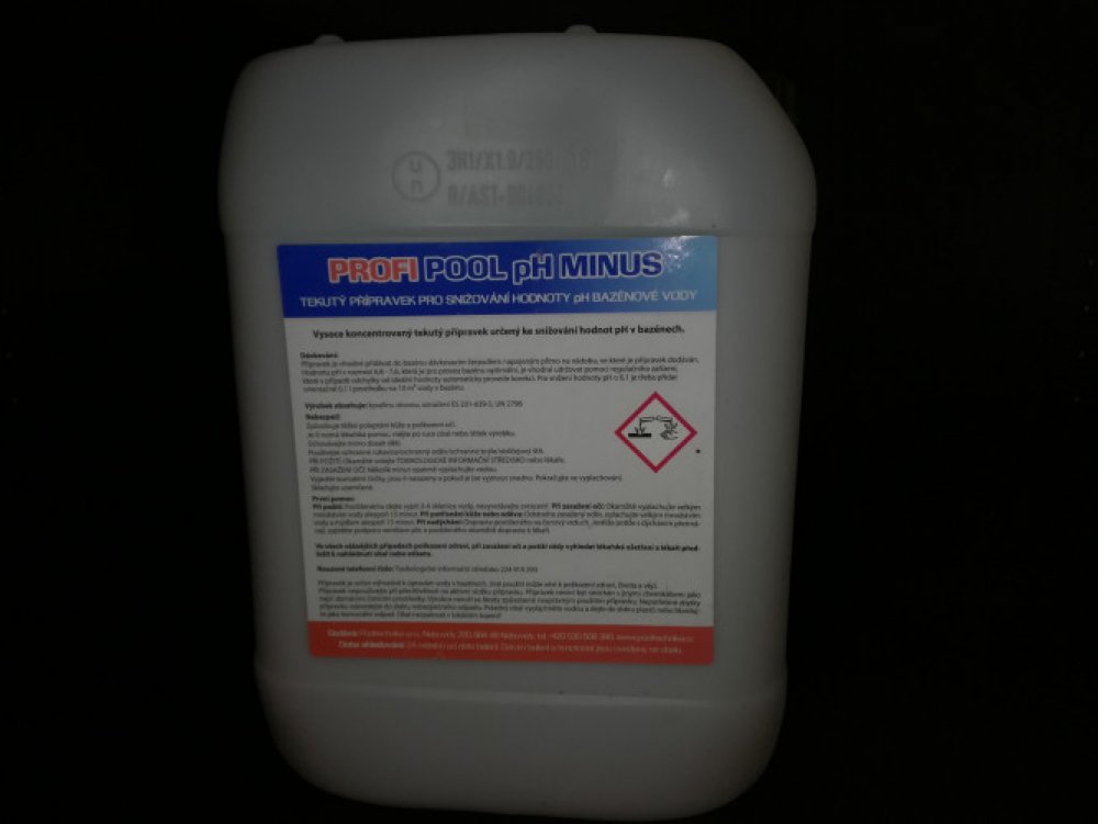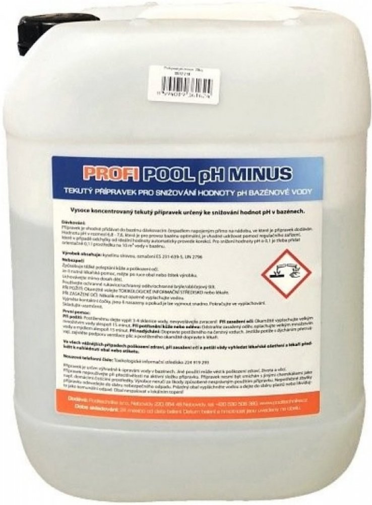 Vše na bazény koupíte v e-shopu Bazenonline.cz! Široký sortiment, výborné ceny, rychlé dodání. PROFIPOOL pH MINUS do bazénu 35 kg - osobní odběr Brno a PrahaTekutá bazénová chemie pro snížení pH vody vhodná pro ruční i automatické dávkování. Ideální hodnota pH v bazénu je 6,8 - 7,4. Toto rozmezí vám zajistí správnou účinnost další bazénové chemie (multifunkčních tablet, tekutého chloru, bezchlorové chemie atd.). Voda bez vyváženého pH může dráždit sliznice a oči.Určení:Pro snížení pH vody v bazénech a vířivkáchPro venkovní i vnitřní bazény a vířivkyZpůsob použití PROFIPOOL pH MINUS do bazénu:Tekuté pH minus lze dávkovat do bazénu dávkovacím čerpadlem, případně automatickým zařízením, které měří a vyhodnocuje stav pH v bazénu. Dávkovat můžete i ručně, v takovém případě pH mínus nejdříve zřeďte v nějaké nádobě a až následně roztok rozlijte po krajích bazénu.Dávkování tekutého pH do bazénu:Ruční dávkování - pro snížení pH o 0,1 je třeba přidat 100 ml přípravku na 10 m3 vodyAutomatické dávkování - podle měřící sondyVarování:Dráždí kůži.Způsobuje vážné podráždění očí.Pro dodání na vaši adresu zvolte níže uvedenou variantu tohoto produktu, v uvedené ceně je již započítané ADR přepravné.Dávkování tekuté bazénové chemie do bazénuTekutou chemii lze dávkovat přímo do bazénu. Stačí rozlít po hladině. Mnohem komfortnější je dávkování pomocí dávkovacích čerpadel na tekuté pH. Dávkovací čerpadla na pH dodáváme ve více provedeních. Manuální čerpadla, které nemají pH sondu a čerpadla s pH sondou, ty poskytují plně automatický provoz při úpravě bazénové vody.Výběr dávkovacích čerpadel na pH. Všechna dávkovací čerpadla najdete zde. Další možností dávkování tekuté chemie jsou bazénové automatiky, které měří a dávkují jak pH, tak i chlor do bazénu. Automatické dávkovací stanice kontinuálně kontrolují a upravují dezinfekci i vyvážení pH.Výběr automatických dávkovačů. Všechny automatiky tekuté chemie najdete zde.
