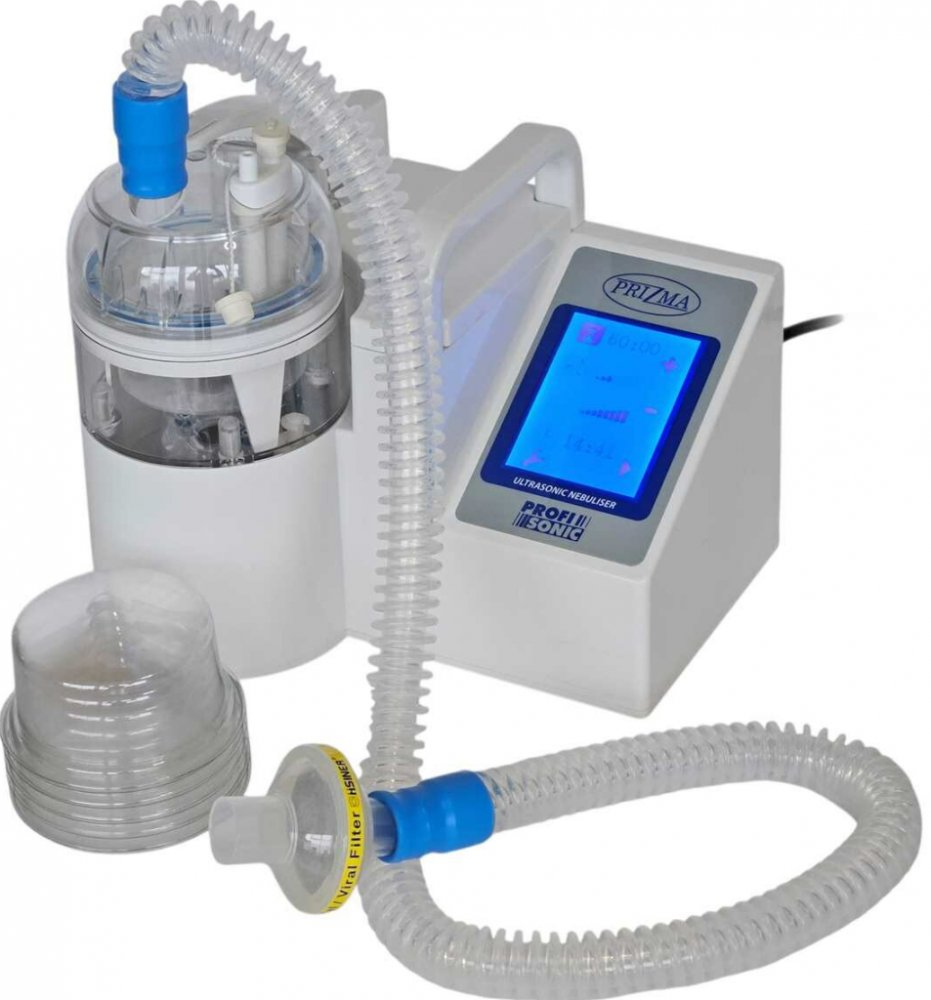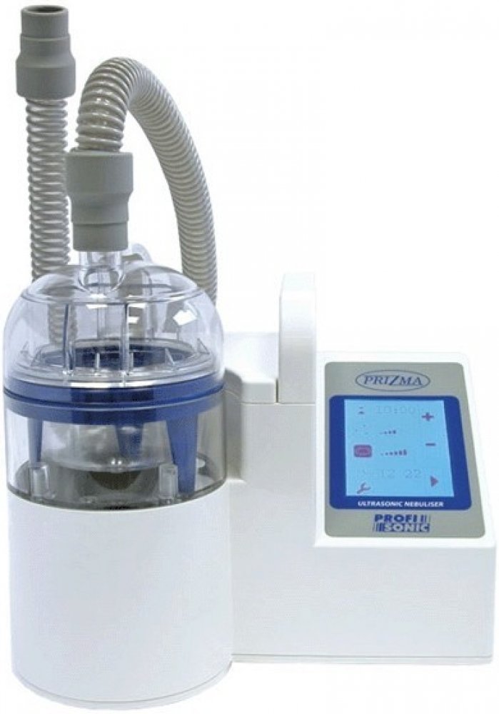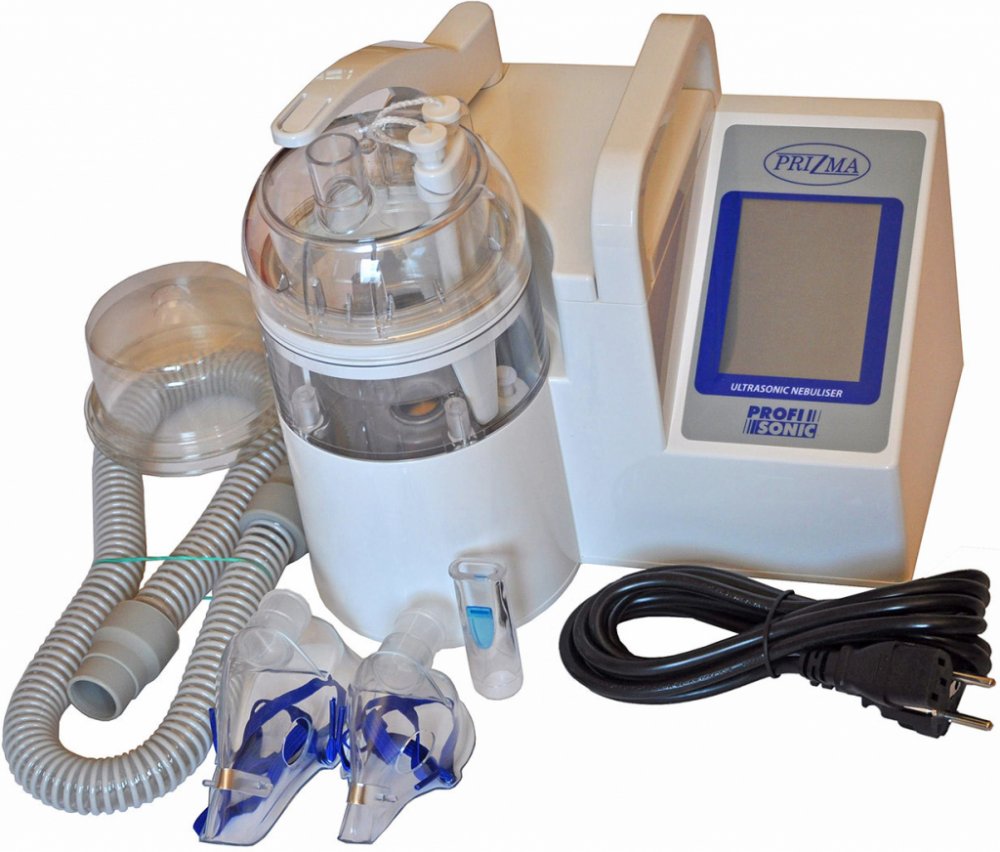 ULTRAZVUKOVÝ NEBULIZÁTOR PRIZMA pro nemocnice, léčebné lázně, respirační kliniky. Profesionální NEBULIZÁTOR PRIZMA s velkým dotykovým LCD displejem na kterém se nastavuje velikost částic a čas, rychlost tvorby a objem proudění. Jde o podobný, ale technicky modernější přístroj jako např. OMRON. Nastavitelný výkon 0 až 3ml / min, nastavitelné proudění až 20 litrů / min, nastavitelná velikost částic 0,5 a 5 mikronů, nastavitelný časovač 1 až 100 minut. Přístroj je zdravotnický prostředkem třídy IIa. Součástí dodávky je inhalační maska ADULT a BABY, vrapová inhalační hadice, inhalační náustek a 3 kloboučky na medikamenty.