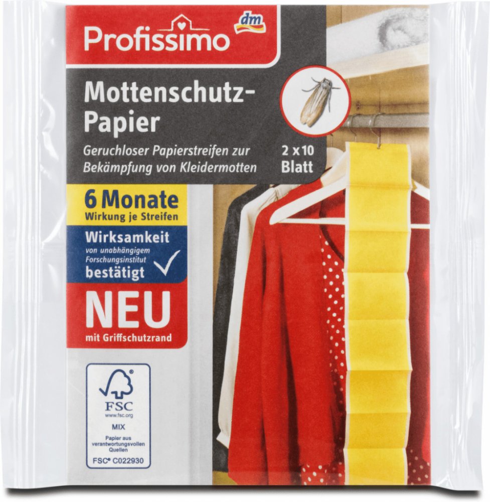Profissimo ochranné pásky proti šatním molům ve vlně, kabátech a kožiších. Zamezí dalšímu napadaní. Každý pásek účinkuje 6 měsíců. Ochranu proti molům tvoří papírové pásky, které po vybalení začnou uvolňovat účinnou látku. Profissimo ochranné pásky proti šatním molům jsou určeny do šatních skříní, zásuvek, truhel atd.
