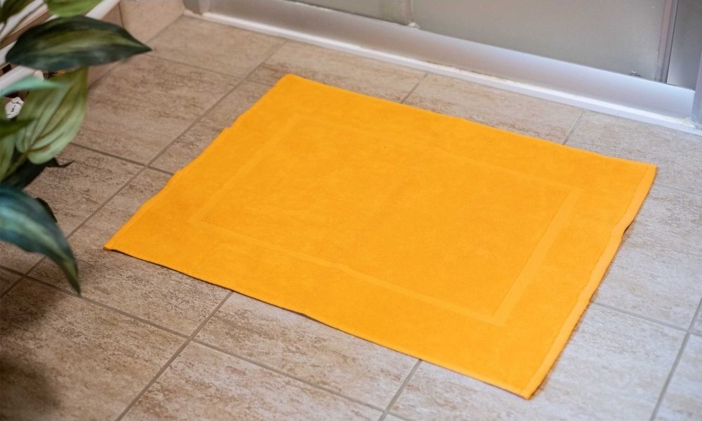 Koupelnová přeložka Comfort v oranžové barvě. Rozměr předložky je 50x70 cm.