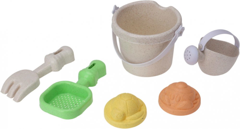 Sada hraček: Sada se skládá z 6 prvků: kyblík s uchy, konvička, lopatka, hrábě a dvě formičky na písečné bábovky.