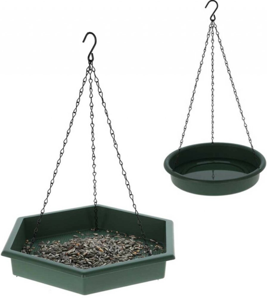 Součástí sady jsou dva prvky – šestiúhelníkové krmítko a kulatá ptačí vanička. Krmítko je vybaveno malými odtokovými otvory v základně, které účinně odvádějí vodu a chrání krmení před navlhnutím. Vanička slouží buď jako pítko, nebo jako koupaliště pro ptáky, čímž přispívá ke spokojenosti a zdraví ptactva v okolí.