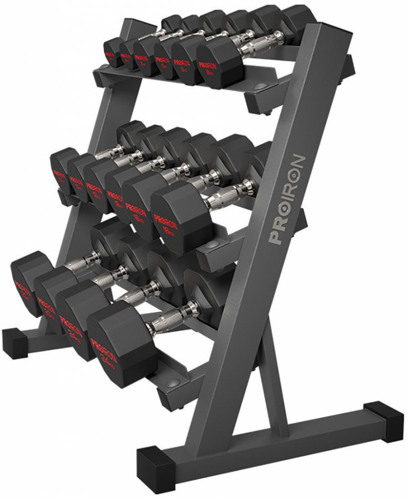Profesionální sada 9 párů kvalitních jednoručních činek od značky PROIRON o hmotnosti 3 - 24 kg. Robustní gumový povrch činek je odolný vůči nárazům a nepoškodí podlahu při pádu. Dvanáctihranná hlavice zajišťují extra stabilitu při daném cvičení. Vroubkovaný povrch a ergonomicky tvarované rukojeti garantují jistý úchop a bezpečné cvičení. Činky výborně poslouží v každé domácí posilovně a v profesionálních studiích, nebo také při venkovním použití. Součástí dodávky je také praktický stojan na činky, díky kterému budete mít činky vždy přehledně a bezpečně uložené.