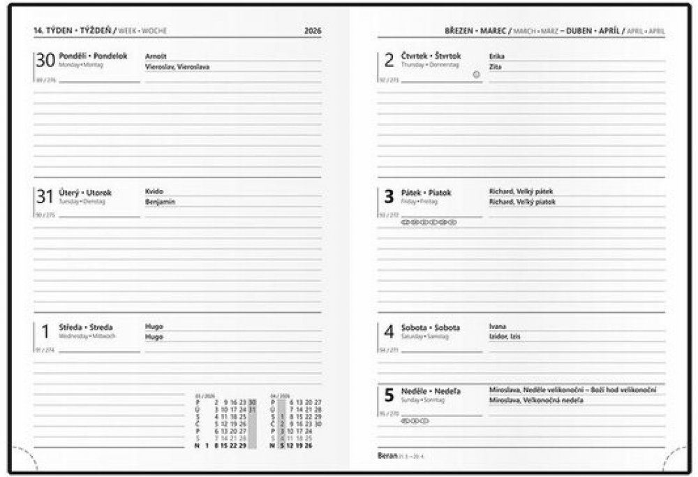 Týdenní diář formátu B6 je vyrobený z matného hladkého lamina s parciálním lakem, který dodává každému diáři šmrnc. Jedná se nejen o skvělý doplněk, ale také si budete moci efektivněji plánovat Váš čas. Navíc se tento oblíbený formát pohodlně vejde do každé tašky či kabelky. Tištěná grafika potažená nepoškrabatelným matným laminem s parciálním lakem, jednostranná pěnová výplň, šitá vazba V8, stužk...