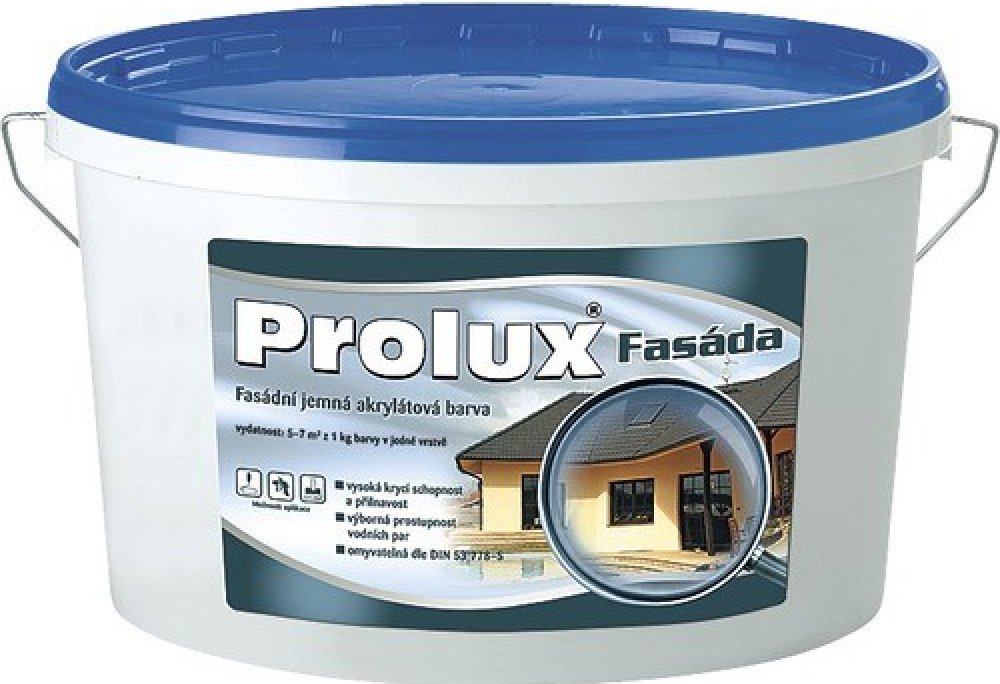 Disperzní akrylátová bílá jemná vodou ředitelná fasádní barva. Benefity: zvýšená odolnost vůči kyselým dešťům a povětrnostním vlivům paropropustnost vysoká krycí schopnost a přilnavost plná omyvatelnost široká škála tónovaných odstínů v tónovacím systému Prolux