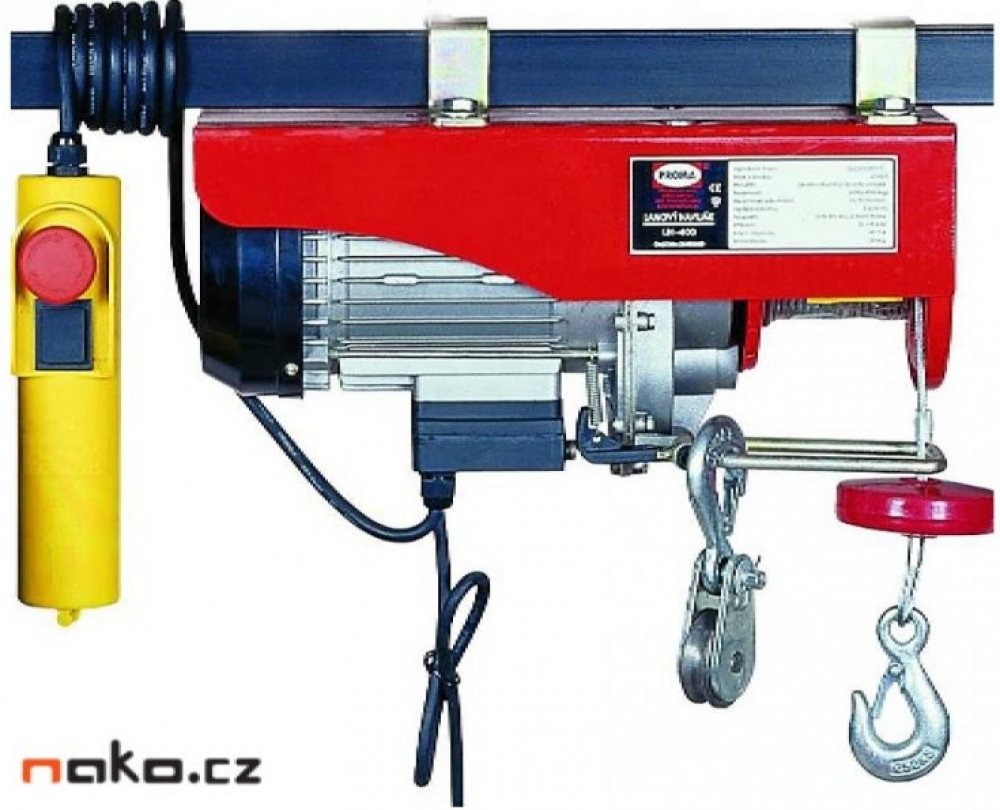 Elektrický lanový naviják PROMA LN- 400 Popis produktu elektrický lanový naviják PROMA LN- 400: Lanový naviják se používá ke zvědání břemen jejichž nosnost nepřevyšuje jeho maximální nosnost. Naviják je vybaven dojezdovou brzdou a úchytkami pro zavěšení. Pohon navijáku zajišťuje jednofázový motor 230V. Naviják lze použít s jednoduchým nebo dvojitým závěsem s využitím kladky. Lanový naviják PROMA j...