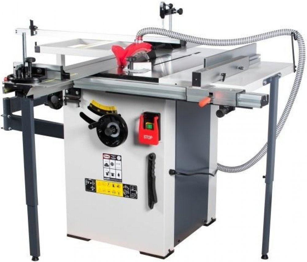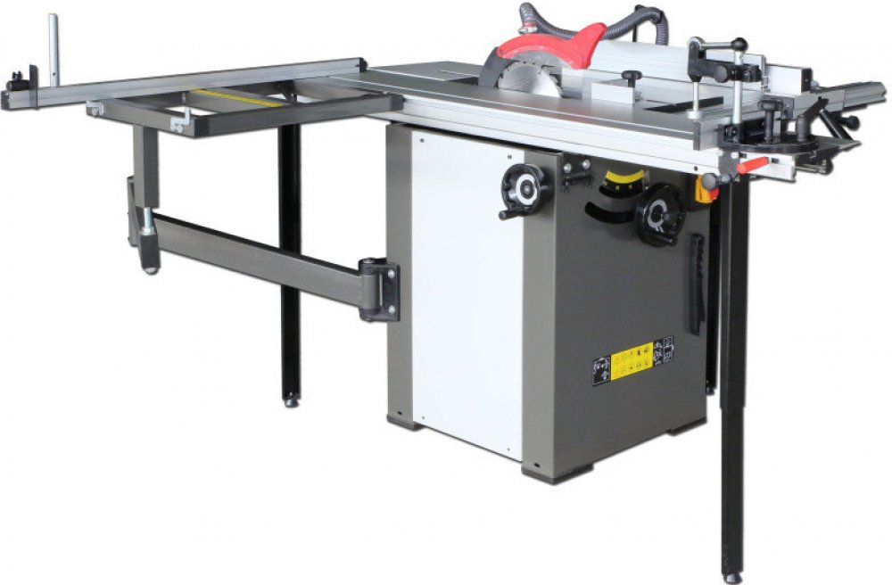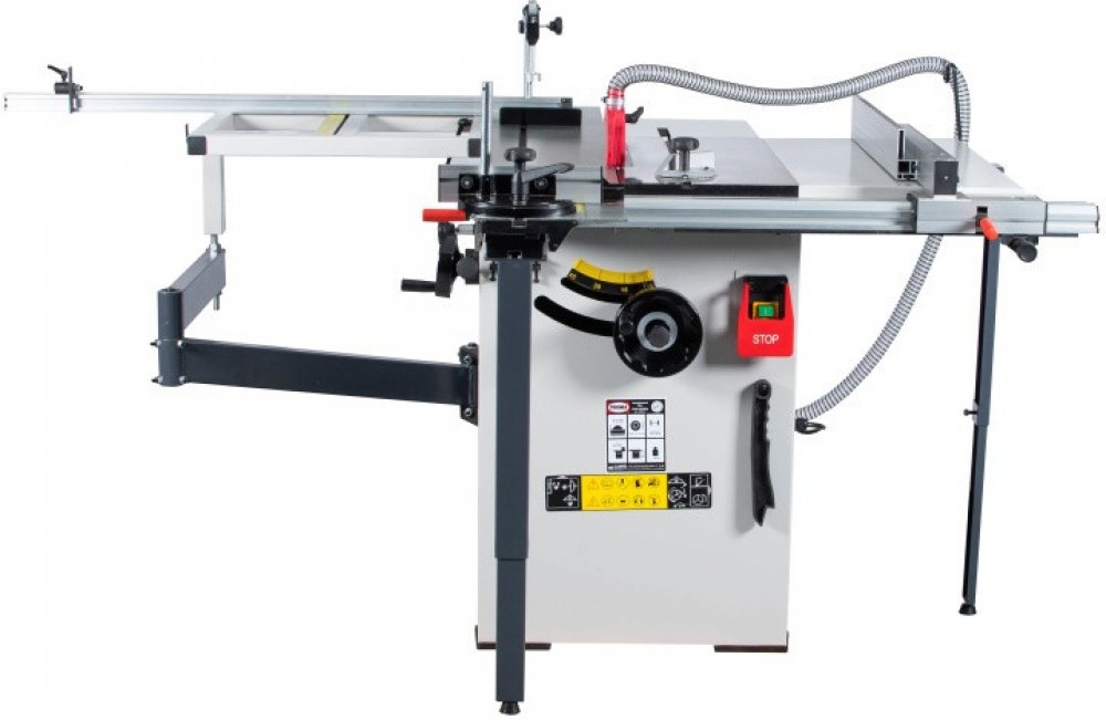 Výkonný hnací motor zaručuje optimální výkon při řezání i při delším provozu. Stabilní a snadno nastavitelný pilový agregát naklápěcí v úhlu od 90° do 45°. Pila je sériově dodávaná s posuvným hliníkovým formátovacím stolem s velikostí 1600 x 240 mm. Sériově je pila vybavená rozšiřovacím a prodlužovacím stolem pro zpracování velkoformátových desek. K přípojce pro odsávání lze připojit hadice o průměru 100 mm a zajistit tak optimální pracovní podmínky. Naklápění pilového kotouče až do 45° podle stupnice je pomocí ručního kola. Masivní stůl pily z šedé litiny, který je přesně opracovaný a broušený do roviny je vybaven T-drážkami umožňuje řezání s úhlovým dorazem. Kombinovaná konstrukce stroje z oceli a litiny je odolná proti zkroucení.