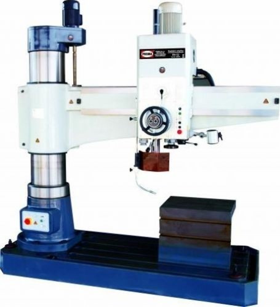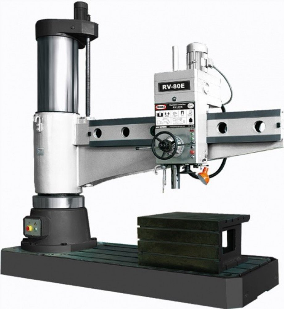 PROMA RV-80E je vlajkovou lodí v oblasti obrábění, představující masivní radiální vrtačku pro nejnáročnější strojírenské provozy. Díky své tuhé a masivní konstrukci umožňuje vrtání do průměru až 80 mm a řezání závitů do oceli M24. Ovládání stroje je maximálně komfortní díky hydraulickému systému, který zajišťuje nejen řazení rychlostí, ale i pevné aretování ve všech osách. Dlouhá životnost a bezúdržbový chod jsou podpořeny systémem trochoidního tenkovrstvého mazání. Vřeteník je vybaven koncovými dorazy a veškeré ovládání, včetně chlazení, je centralizováno na panelu umístěném na sloupu.