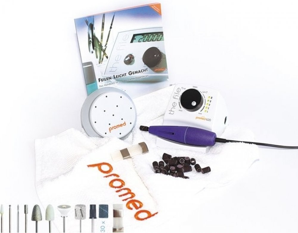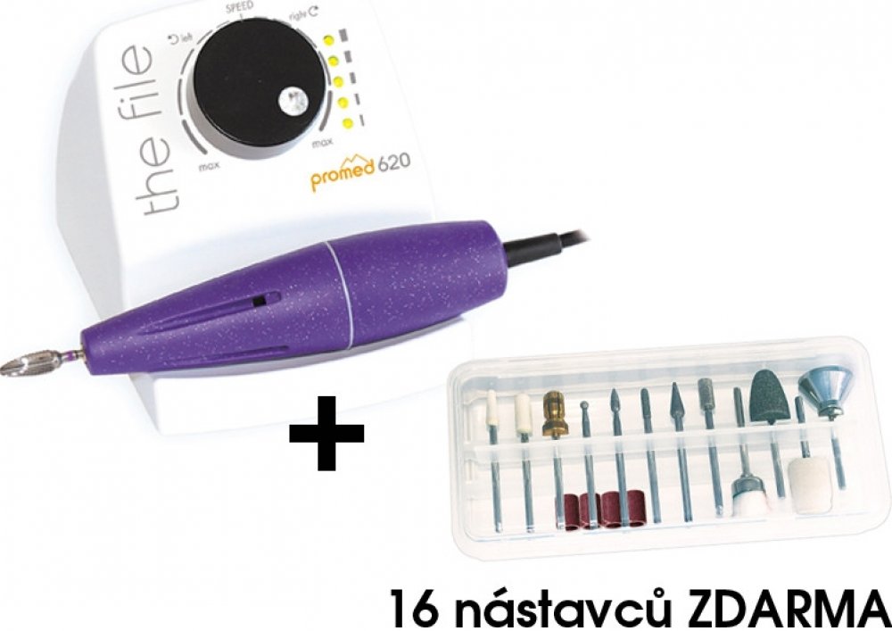 Bruska Promed 620 de luxe (včetně 43 kusů příslušenství). včetně 43 kusů příslušenství, 30W, 0-20000 otáček, pro nástavce průměr stopky 2.35mm