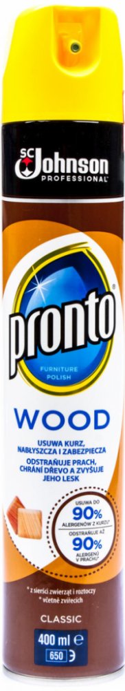 Pronto Classic na dřevo ve formě aerosolu je čistící prostředek na čištění a obnovu lesku vašeho dřeva vždy, když utíráte prach. Přípravek je vhodný pro použití na všechny dřevěné povrchy s povrchovou úpravou. Certifikáty a výstražné symbolyBezpečnostní list (.pdf)