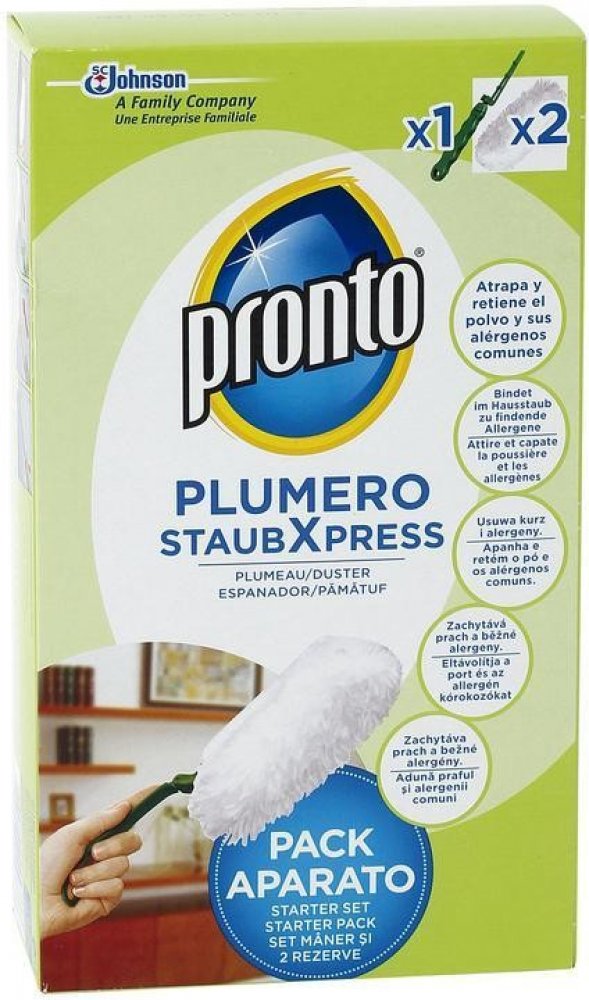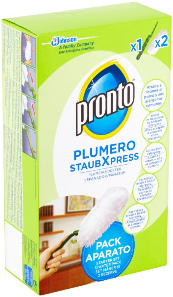 Pronto prachovka poslouží při odstraňování veškerého prachu a alergenů ve vaší domácnosti. Díky své vysoké praktičnosti se tak jistě stane nepostradatelným doplňkem při úklidu domácnosti. Balení obsahuje 1 ks rukojeť a 2 ks prachovky. Obsah balení: 1x rukojeť + 2x náhradní hlavice. Značka: Pronto. Výrobce: SC Johnson.POUŽITÍ:Vyndejte náhradu z obalu a nasadně na rukojeť.UPOZORNĚNÍ:Nepoužívejte na horké či mokré povrchy. Nepoužívejte s žádnými čistícími prostředky ani s vodou. Nesplachujte do záchodu. Uchovávejte mimo dosah dětí.ŽIVOTNÍ PROSTŘEDÍ:Zcela prázdný a čistý papírový obal je možné recyklovat.