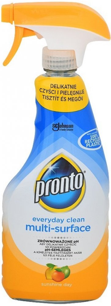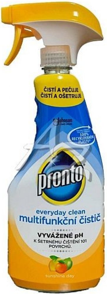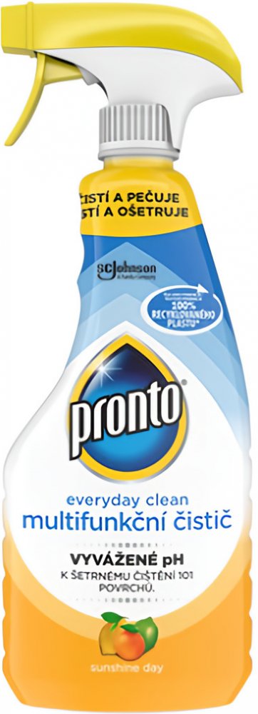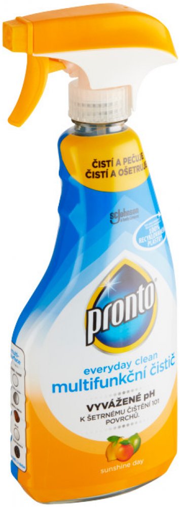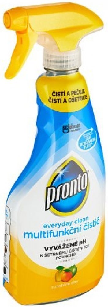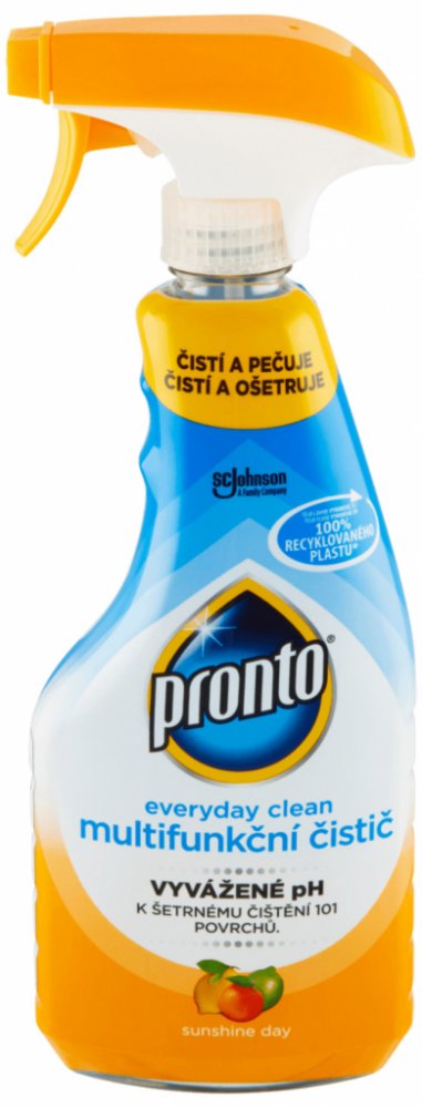 Vyvážené pH pro zdůraznění krásy vašeho domova. Pronto everyday clean multifunkční čistič je určený k odstraňování nečistot, ale dostatečně jemný pro každodenní použití. Složení výrobku šetrně odstraňuje nečistoty bez poškození povrchů nebo zanechání šmouh. Vyrobeno bez silikonu. Nepoužívejte na materiály bez povrchové úpravy: dřevo, mramor či žulu.POUŽITÍ:Otočte trysku do pozice ON. Nastříkejte. Setřete. Lehce nastříkejte přípravek na povrch a setřete jemným hadříkem nebo papírovou utěrkou. Není nutné oplachování. V případě použití na elektronická zařízení, nastříkejte na hadřík a postupujte dle pokynů výrobce. Doporučuje se otestovat účinek přípravku na malém skrytém místě. Elektrická zařízení nejprve odpojte.SLOŽENÍ:<5% neiontové povrchově aktivní látky, parfémy, methylisothiazolinone.UPOZORNĚNÍ:Může vyvolat alergickou kožní reakci. Je-li nutná lékařská pomoc, mějte po ruce obal nebo štítek výrobkU. Uchovávejte mimo dosah dětí. Při styku s kůží: Omyjte velkým množstvím vody a mýdla. Při zasažení očí: Několik minut opatrně vyplachujte vodou. Vyjměte kontaktní čočky, jsou-li nasazeny a pokud je lze vyjmout snadno. Pokračujte ve vyplachování. Odstraňte obsah / obal v rámci tříděného odpadu v souladu se zákonem o odpadech. Používejte ochranné rukavice. Používejte pouze v dobře větraných prostorách.