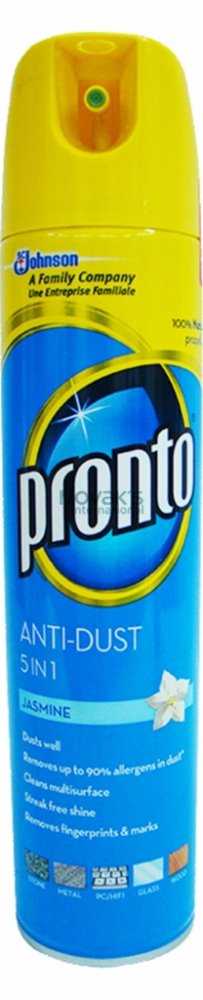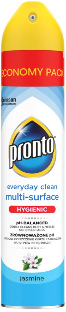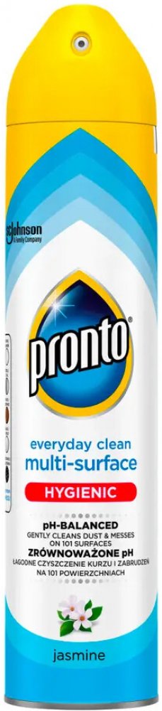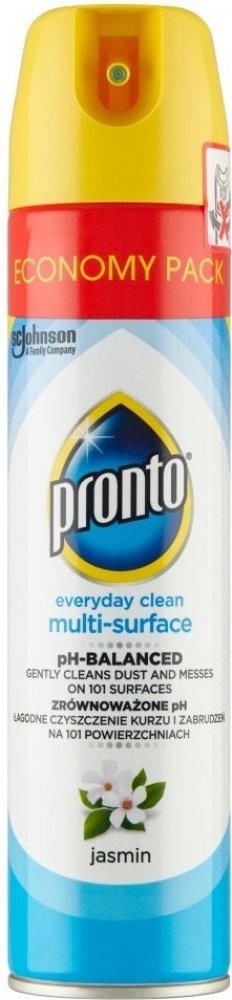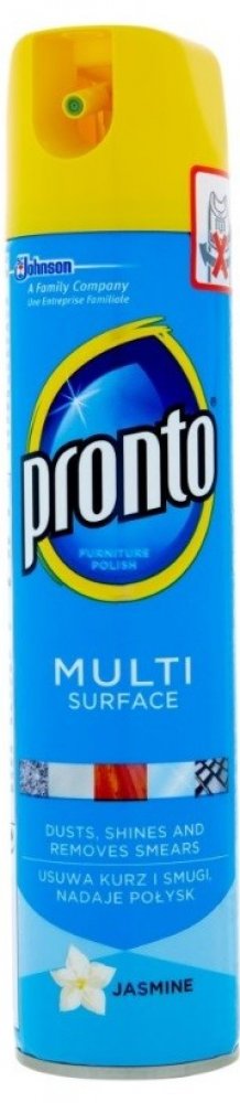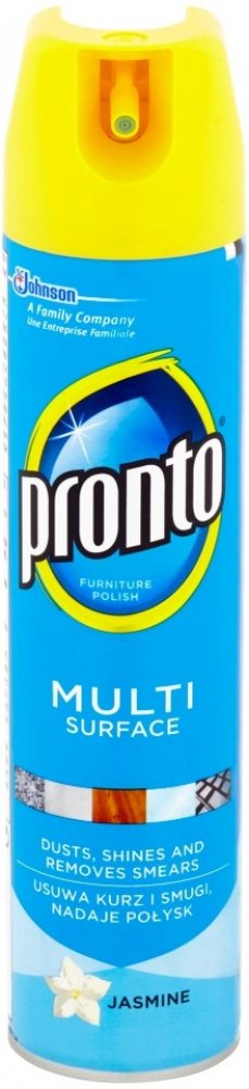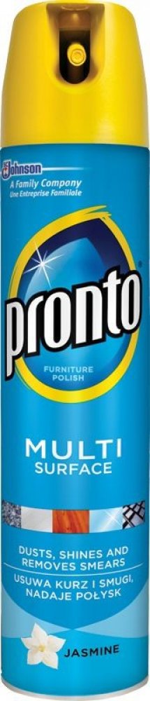 Prontomultifunkční sprej s vůní jasmínu dokonale odstraňuje prach, šmouhy aotisky. Obsahuje antistatické složky, které zabraňují opětovnému usazování prachu. Jemně čistí a odstraňuje prach z kovu, dřeva, skla a elektroniky (kromě plazmových/LCD obrazovek). Není vhodný pro použití na dřevo bez povrchové úpravy. Pronto poskytuje vašemu nábytku dokonalou péči a ochranu.