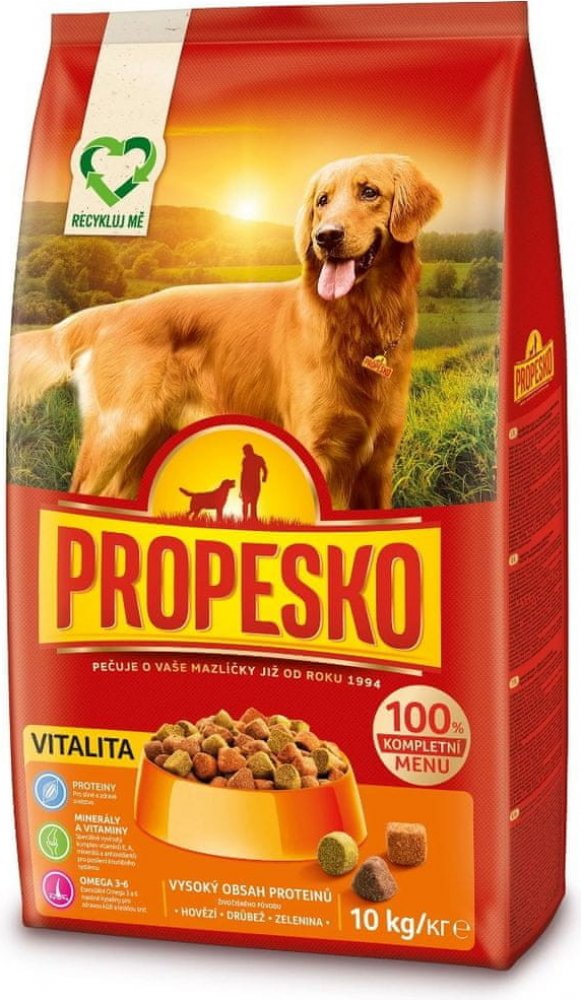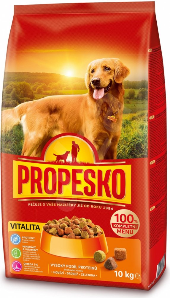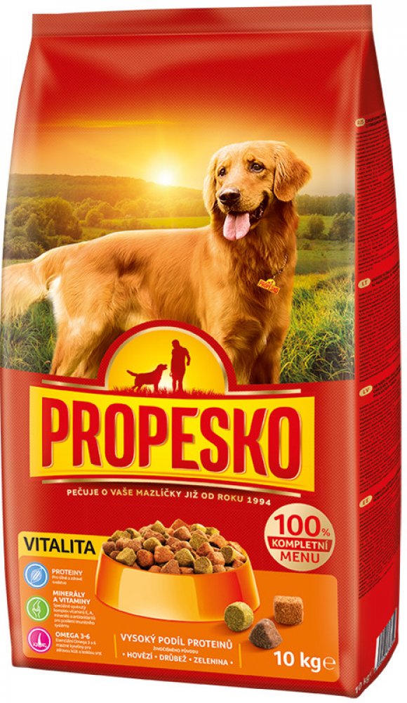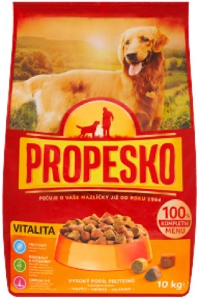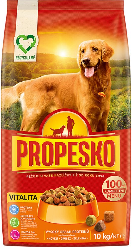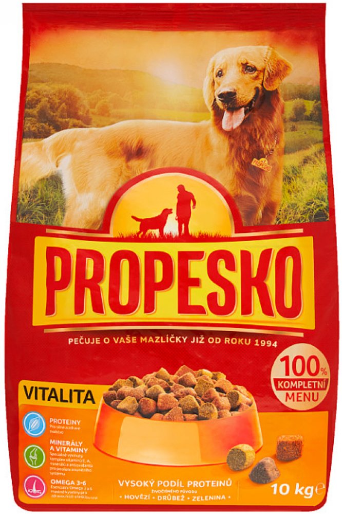 Partner in Pet Food pro dospělé pro všechna plemena s běžnou aktivitou drůbeží Propesko 10 kg prémiové suché tvrdé Vitality 22.0 % obiloviny z České republiky nízká (<200 mg) 10.0 % 3.5 % 8 % není zaručeno standardní (<25%) standardní základní postupný přechod (4–7 dní) pasivní (prebiotika) možné základní