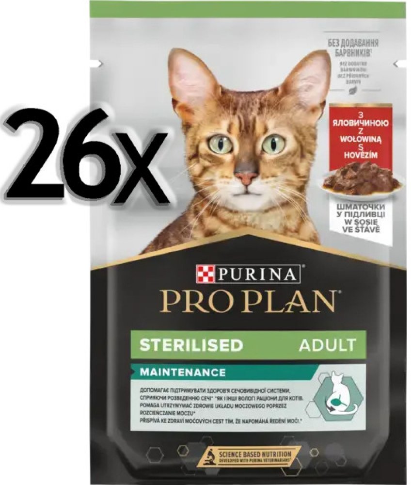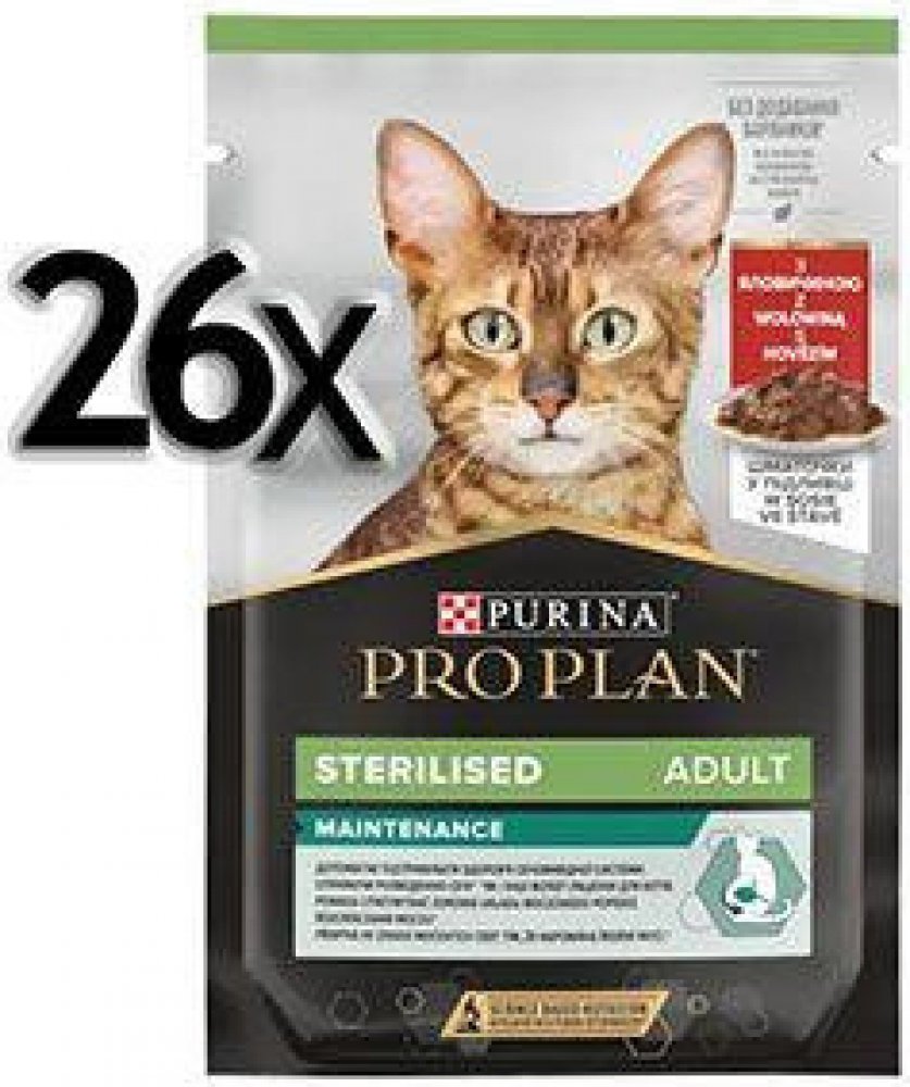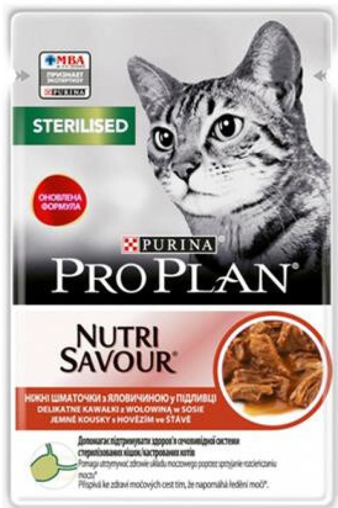 Kompletní krmivo pro sterilizované nebo kastrované kočky s hovězí příchutí. Vyšší obsah bílkovin a nižší obsah tuků pro udržení zdravé tělesné hmotnosti. Obsahuje antioxidanty pro posílení přirozené obranyschopnosti. Umožní žít Vaší kočce zdravý a aktivní život po sterilizaci. Pomáhá předejít zbytečnému nárůstu tělesné hmotnosti. Složení: maso a vedlejší výrobky živočišného původu (z toho 4 % hovězí), rostlinné bílkovinné extrakty, ryby a vedlejší výrobky z ryb, vedlejší výrobky rostlinného původu, minerální látky, oleje a tuky, cukry. Analytické složky: vlhkost 78%, protein 13%, obsah tuku 3,3%, Omega-6 mastné kyseliny 0,9%, Omega-3 mastné kyseliny 0,1%, DHA 0,01%, Sacharidy 3%, Hrubá vláknina 0,3%, Vápník 0,3%, fosfor 0,3%, Vitamin A 13050 mjkg, vitamín D 529mjkg, vitamín E 195 mjkg, Metabolizovatelná energie (ME) 0,85%. Balení 26 kusů kapsiček.