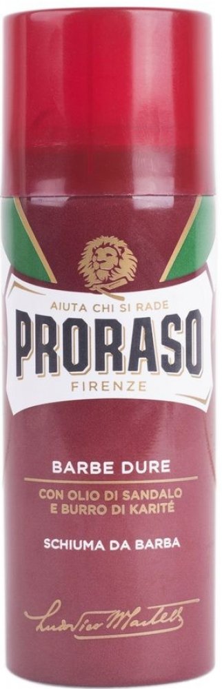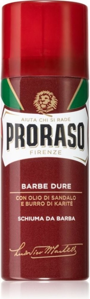 Pěna na holení z červené řady Proraso - to znamená jemnou vůni santalového dřeva a složení pro husté vousy. ...